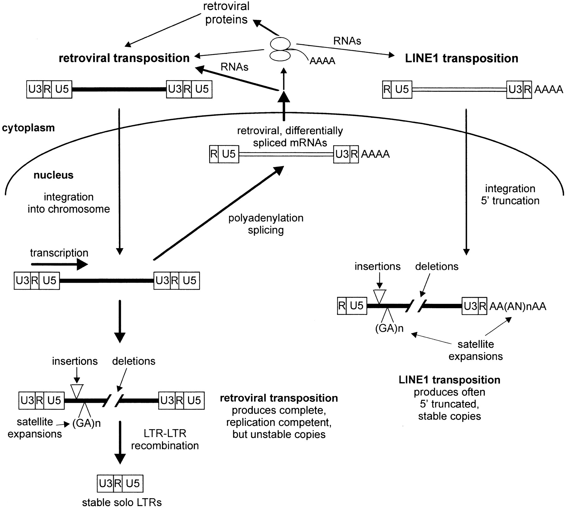 Schematic representation of amplification of poly(A) and retro copies, differences, and stability in the genome.