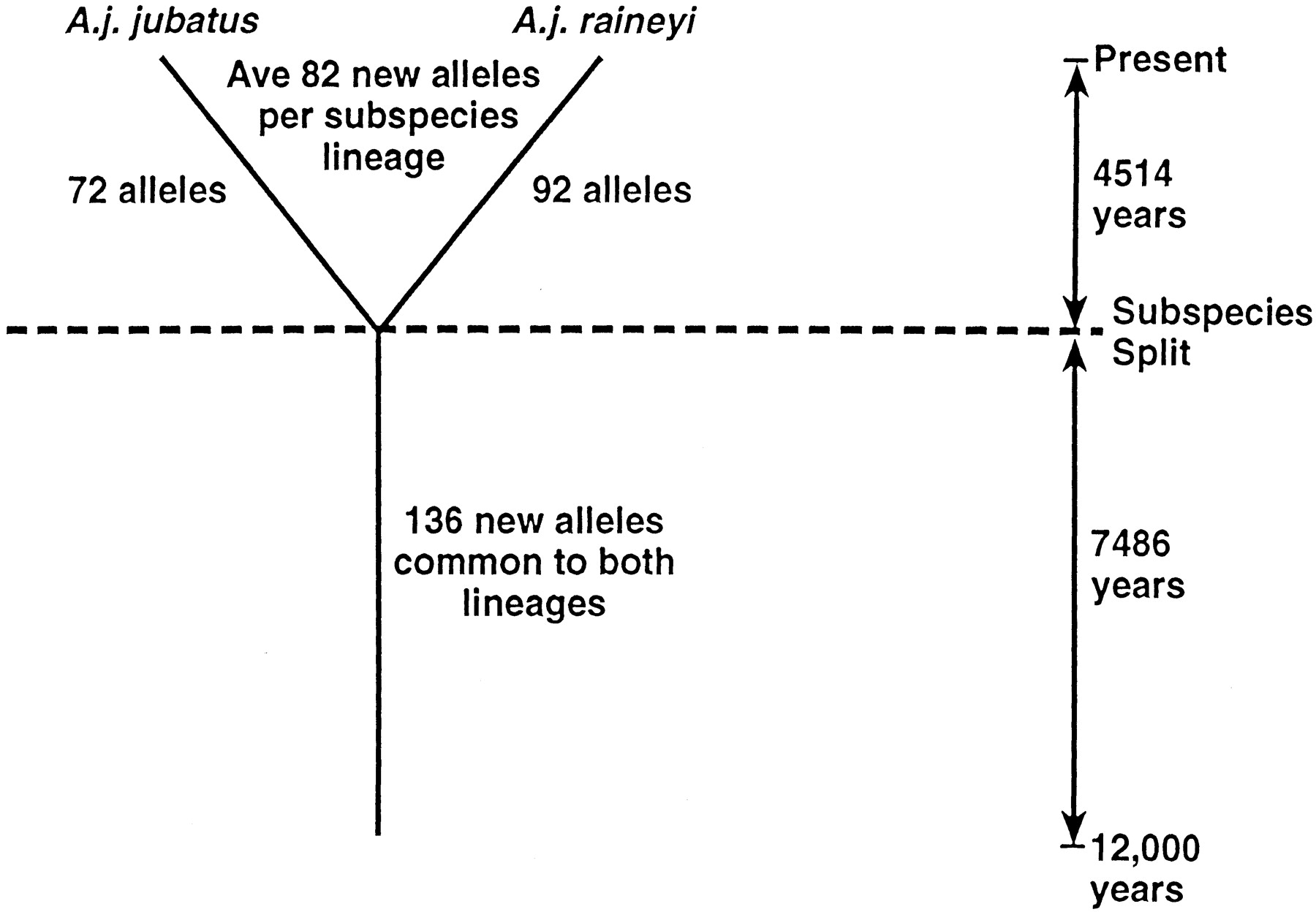Schematic representation of new allele reconstitution at 82 microsatellite loci in cheetah populations since the homogenizing bottleneck, estimated at 12,000 yr ago (see text). Common alleles are those shared between the two geographically isolated subspecies (A. j. jubatus and A. j. raineyi). Unique alleles, which were likely produced by mutation after the geographic isolation of the subspecies, are alleles represented in one subspecies but not the other. The calculation of allele reconstitution would include a back-mutation bias, particularly as time and/or distances grow larger; however, the close agreement of the (δμ)2 estimate with the allele reconstitution calculations (see text) offers some assurance that the estimates would approximate the time period considered here.