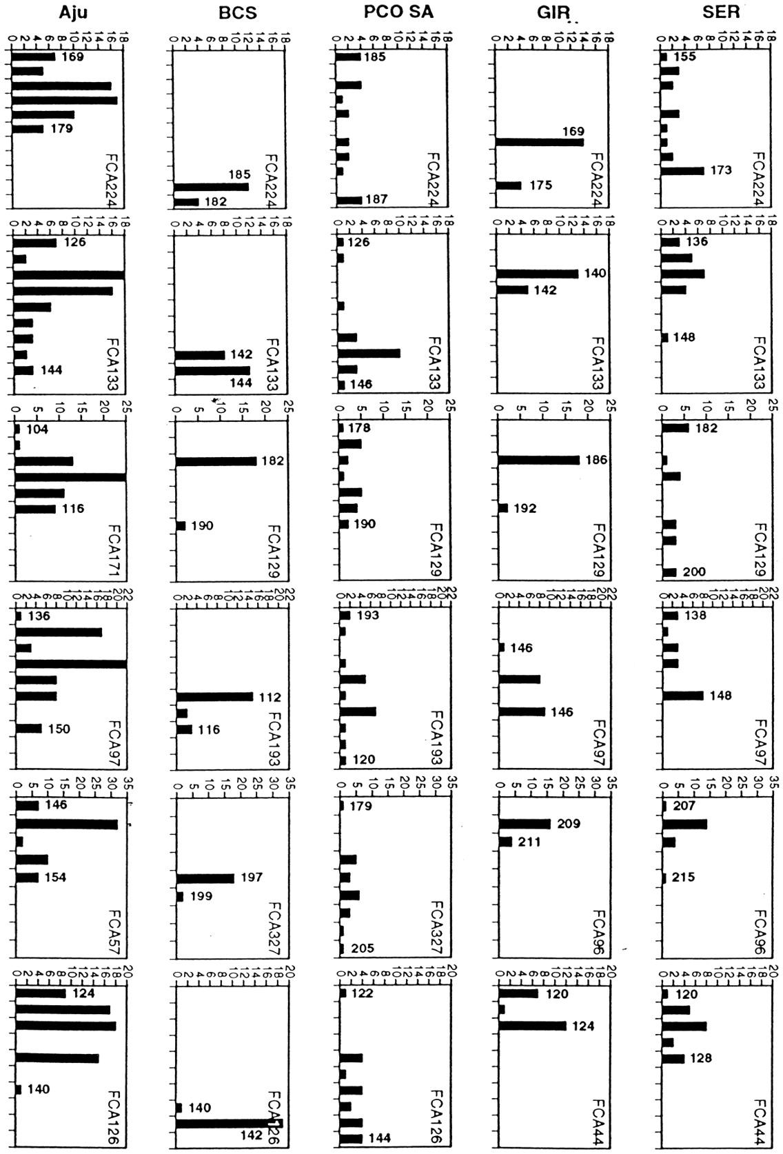 Frequency distribution of alleles at homologous microsatellite loci among lions (SER and GIR), pumas (PCO-SA and BCS), and cheetahs (Aju). Each graph shows 2-bp (CA repeat) increments on either side of the most common allele in the outbred population plotted (horizontal axis) against number of alleles (vertical axis). For homologous loci, allele sizes are comparable within species, but not between species. Allele size of the largest and smallest alleles for each population are indicated by number above bar. FCA### is the name of the actual microsatellite locus (Menotti-Raymond et al. 1999).