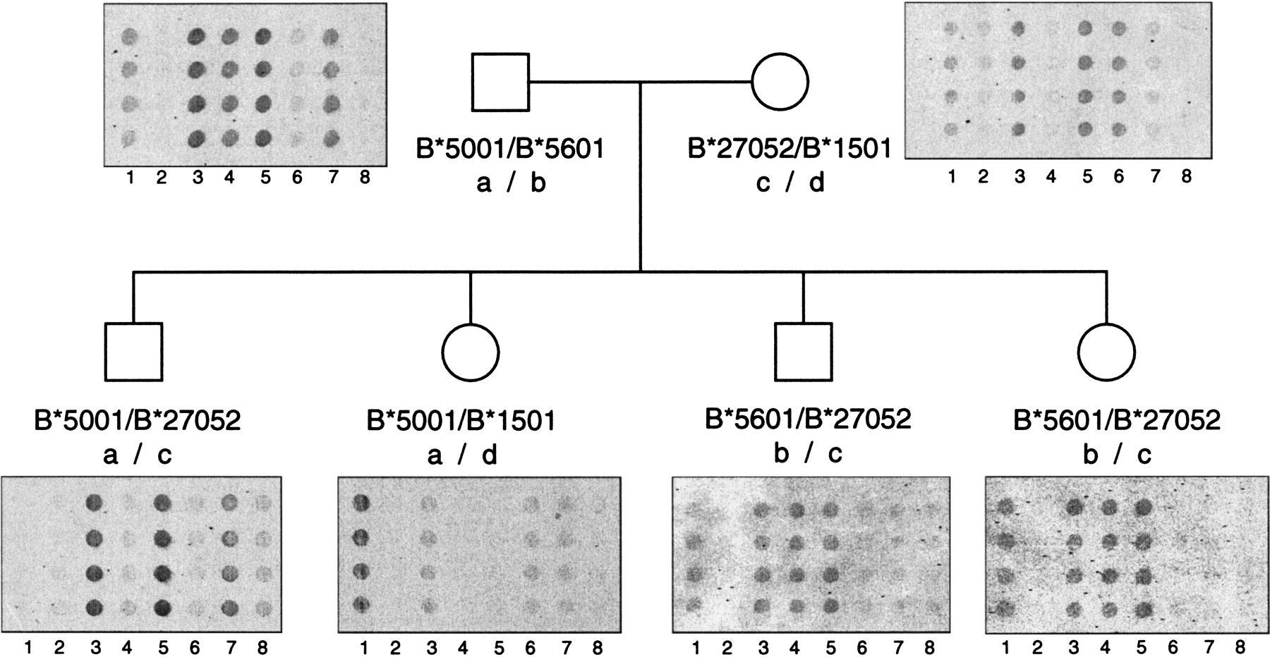 Segregation of HLA-B SNPs in a family study. Probes descriptive for positions 154–173 (lanes 1–4) and positions 194–213 (lanes 5–8) of exon 2 are illustrated for HLA-B*5001 (paternal “a” haplotype, lanes 3 and7), HLA-B*5601 (paternal “b” haplotype, lanes 4and 5), B*27052 (maternal “c” haplotype, lanes 3and 5) and B*1501 (maternal “d” haplotype, lanes1 and 6). Positions of the probes are numbered according to the HLA/IMGT database. Cross-hybridization is observed for eight of the 137 (6%) probes, however, these spurious signals can be identified by analyzing the hybridization results of the other probes in the group. For example, the two family members with the “b/c” haplotype in this figure demonstrate a false-positive hybridization with the probe in lane 1. Despite the signal from this probe, the correct allele was called because of the lack of signal from the probe in lane 6.