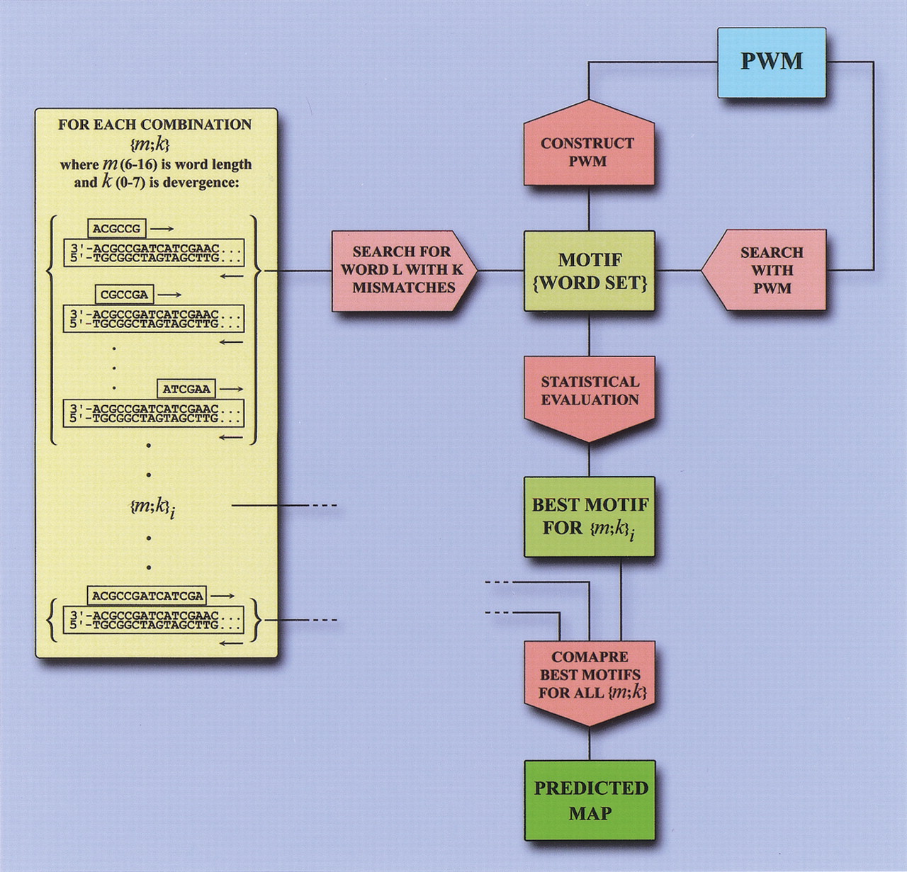 Scanseq algorithm. Initial search is performed with words of length m with 0-k mismatches. For each word found in the sequence, the corresponding motif (word set), is refined by positional weight matrix (PWM), and is statistically evaluated through Z score. In the final stage, Z scores for motifs within a range ofm and k are compared and a predicted map is generated. Note that the PWM in the Scanseq algorithm is not the same as in the strategy of BSTF map construction, and it does not include any a priori information about binding motifs.