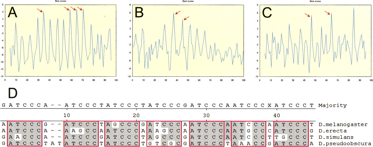Structure and conservation of tandem repeats. Periodic structures of ∼100-bp region from even-skipped stripe 2 (A,D), even-skipped stripe 4+6 (B), andfushi-tarazu proximal enhancer (C) are revealed by matrix search for Bicoid, Knirps, and Tramtrack, respectively (see also Table 5). The red arrows indicate sites that produce a positional weight matrix score in the 4–6 range (shadow sites). Evolutionary conservation in four species of Drosophila is shown foreve stripe 2 (ATCCC)n (D).