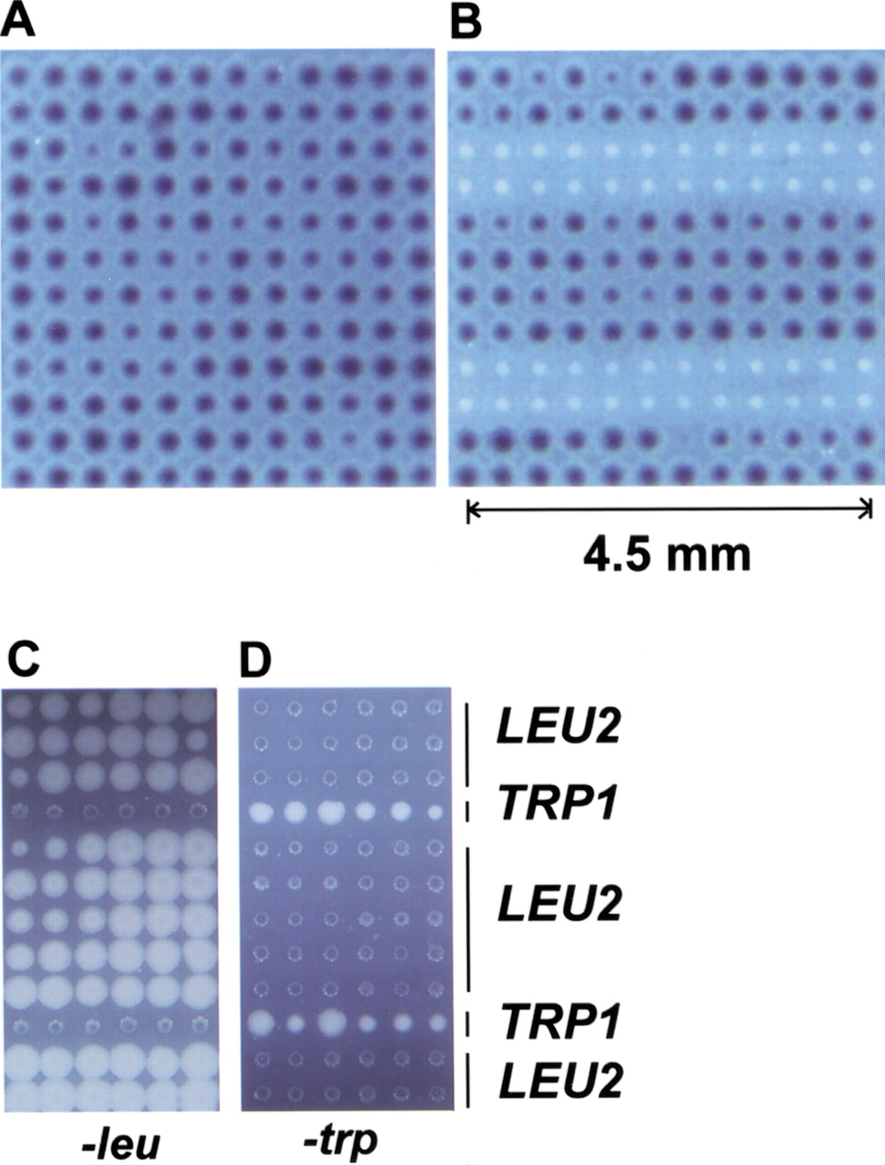 Cell microarrays of E. coli and S. cerevisiae. (A) E. coli cell microarrays (144 colonies) expressing β-galactosidase in the presence of S-gal (3,4-cyclohexenoesculectin-β-D-galactopyranoside), a chromogenic substrate for β-galactosidase. (B) E. coli cell microarrays with 48 colonies that did not express β-galactosidase. (C) S. cerevisiae microarrays grown on synthetic medium without leucine. (D) S. cerevisiae microarrays grown on synthetic medium without tryptophan. Bacterial cell microarrays were placed on the surface of LB in the presence of 50 μg/mL S-gal at 37°C overnight. Yeast cell microarrays were placed on the surface of dropout media indicated in the figure at 30°C overnight.