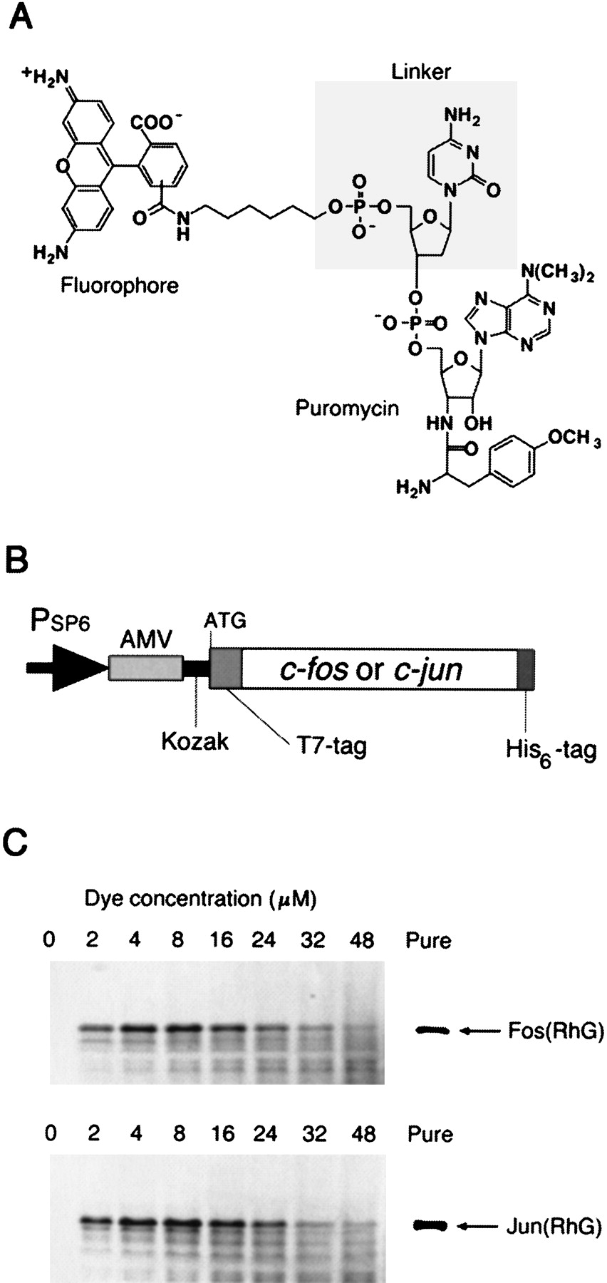 Fluorescence labeling of proteins. (A) The structure of fluorescent puromycin. A fluorophore (fluorescein, RhG, TAMRA, Cy3, or Cy5) was chemically joined to puromycin through a linker (dC, dCdC, rC, rCrC, or none). (B) Template DNA containing SP6 promoter (Morishita et al. 1999), AMV (alfalfa mosaic virus) leader sequence (Jobling and Gehrke 1987), Kozak sequence (Kozak 1986), andc-fos (118–211 amino acids) or c-jun (216–318 amino acids) gene with T7-tag (11 amino acids, MASMTGGQQMG) and His6-tag sequences. (C) RhG-labeled Fos and Jun proteins. In vitro translation reaction was carried out in the presence of the template RNA and 0–48 μM of RhG–dC–puromycin. The products were analyzed by 16.5% Tricine-SDS-PAGE with an imaging analyzer. The labeled proteins with His6-tag were purified by affinity chromatography (Pure).