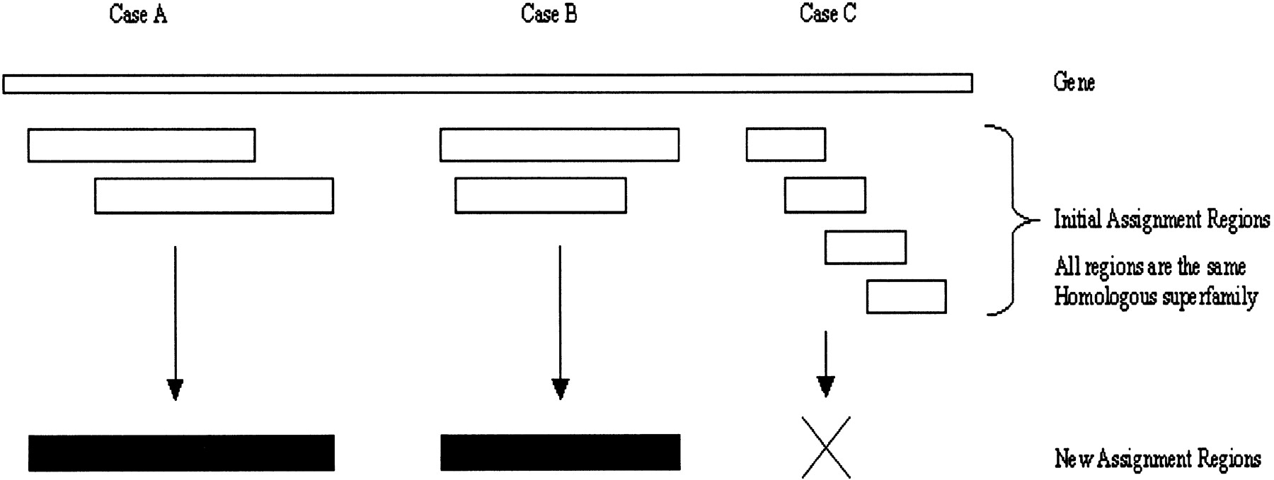 The Collapse module consensus assignments. Boxes, shown in white, represent consensus regions on the ‘Gene’, and the ‘New assignment’ boxes, in black, represent the possible outcomes of collapsing the initial assignments. The Collapse module seeks to allow cases A and B without allowing case C (Chaining). In case A, the two regions from the same homologous superfamily overlap to a great enough extent that they are merged together. In case B, one region is contained within another region of the same homologous superfamily and they are merged. In case C, it is clear that the top and bottom regions do not overlap, so merging of all four regions is not allowed.