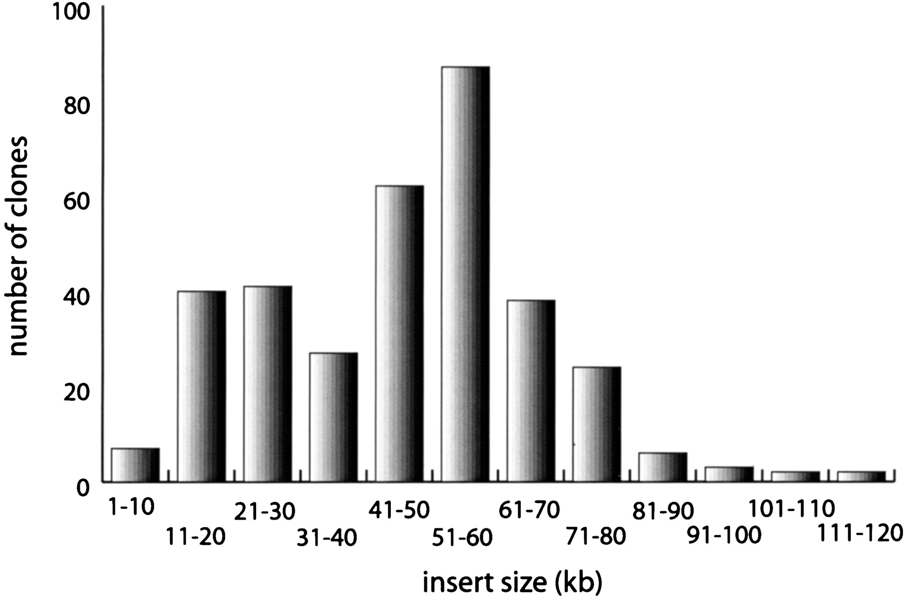 Distribution of insert lengths of the 339 end-sequenced clones of theT. pallidum library. The average insert size was 46.7 kb and the insert length ranged from 6.4 to 120.4 kb as calculated by comparison to the genomic sequence. The major peak corresponds to insert lengths of 51–60 kb and a second, minor peak was observed for insert lengths 11–30 kb.