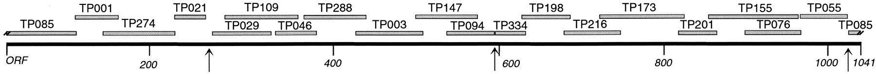 The minimal set of 19 clones covering >98% of the T. pallidum chromosome. Positions of individual clones are shown and arrows indicate gaps in the coverage. Altogether, 14 T. pallidum ORFs are missing or incomplete in this minimal set: TP0241–TP0252, TP0596, and TP1027.