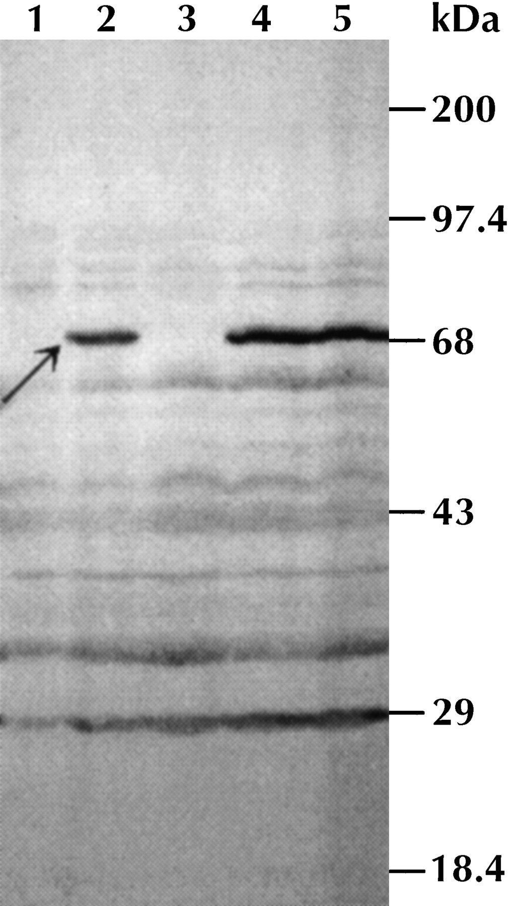Western blot analysis of T. pallidum clones. Strains were grown overnight and protein samples were run in 10% SDS-PAGE gels. Gene products were visualized using pooled sera from rabbits infected with T. pallidum and horseradish peroxidase labeled antirabbit secondary antibody after chemiluminescent detection. Lanes: 1, DH10B pBeloBAC11; 2, DH10B pDSTP021; 3,DH10B pDSTP012; 4, DH10B pDSTP108; and 5, DH10B pDSTP179. pDSTP021 codes for 37 ORFs (TP0203–TP0240), pDSTP012 for 13 (TP0217–TP0229), pDSTP108 codes for 50 (TP0188–TP0237), and pDSTP179 codes for 28 (TP0198–TP0225).