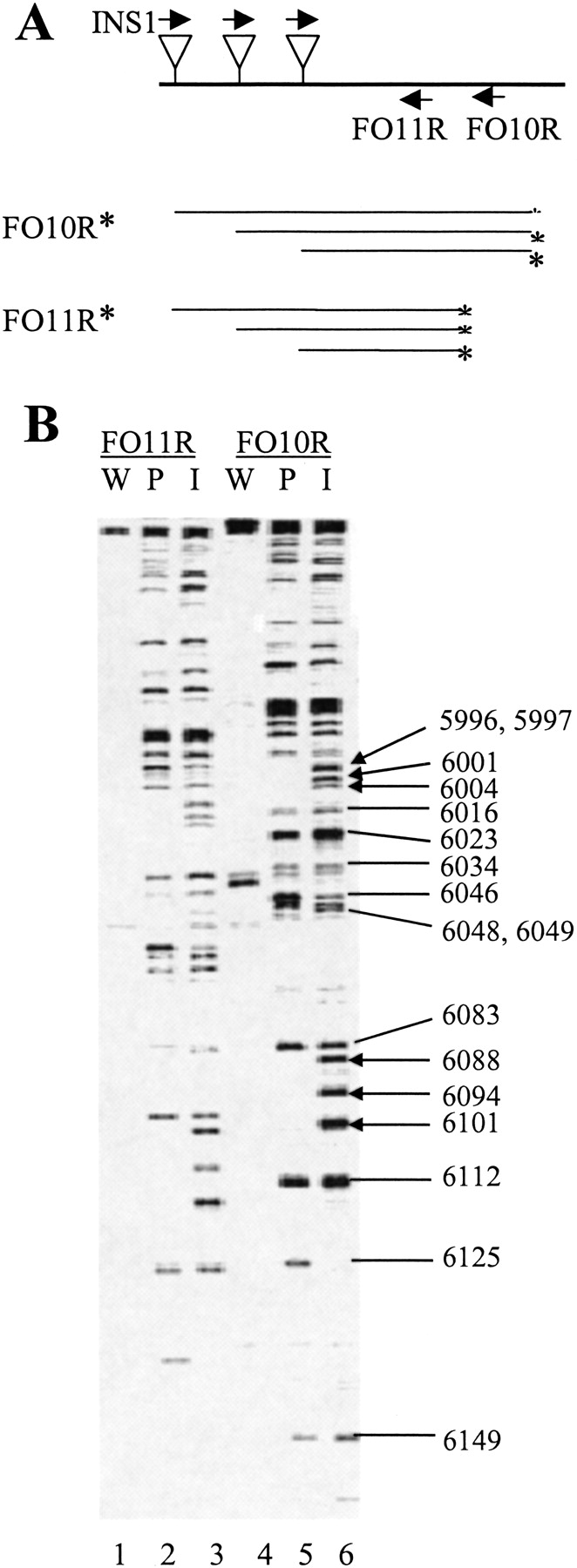 Collection and analysis of footprinting data. (A) Insertion-specific amplification from the genome segment spanning the region between nt 5152 and nt 6375 was performed using the primer pairs INS1/FO10R (FO10R: 5′-ATTCAACCGACTCTTTCTTCTGTG) and INS1/FO11R (FO11R: 5′-TTCTTCTGTGGTAGTTCAGCATAGT). The products were labeled as indicated by asterisks. (B) The labeled reaction products were analyzed by urea-PAGE. The patterns generated from pPVA-Mu before and after selection for replication in protoplasts are indicated by ‘I’ and ‘P,’ respectively. The patterns from the wild-type clone (pPVA) are indicated by ‘W.’ Genomic location numbers (as in Fig. 5) refer to products labeled with FO10R. Arrows highlight insertions that are missing after selection. Labeling primers are indicated on the top of the gel, and sample numbers are given below each lane.