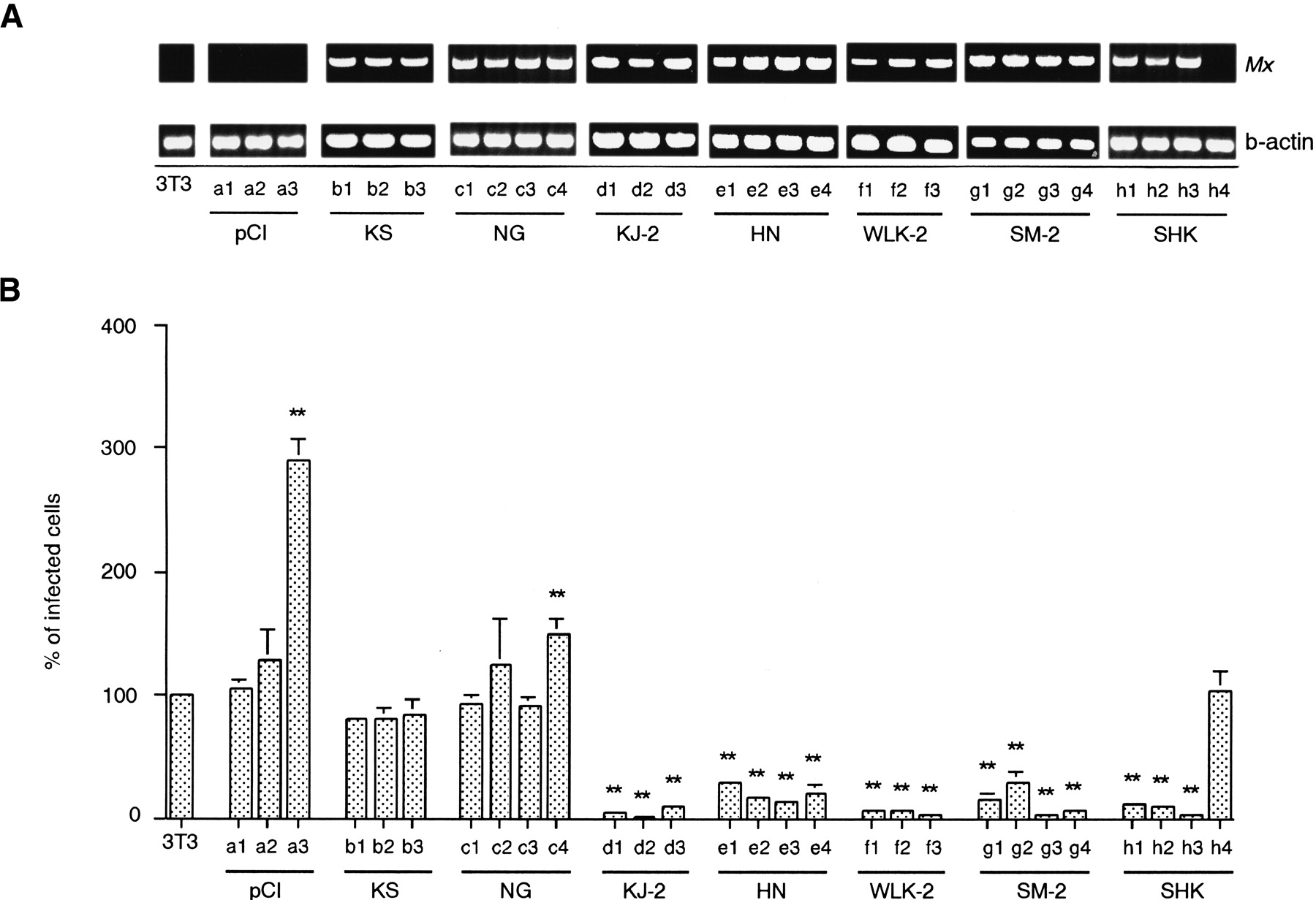 (A) The expression of Mx mRNA in each clone. Total RNA from transfected 3T3 cells was reverse transcribed and PCR amplified using Mx primers (top) and β-actin primers (bottom). 3T3, parental 3T3 cells; pCI (a1–3), control 3T3-pCI-neo; KS (b1–3), 3T3 cells expressing KS MxmRNA; NG (c1–4), 3T3 cells expressing NG Mx mRNA; KJ-2 (d1–3), 3T3 cells expressing KJ-2 Mx mRNA; HN (e1–4), 3T3 cells expressing HN Mx mRNA; WLK-2 (f1–3), 3T3 cells expressing WLK-2 Mx mRNA; SM-2 (g1–4), 3T3 cells expressing SM-2 Mx mRNA; and SHK (h1–3; h4 failed to express theMx mRNA), 3T3 cells expressing SHK Mx mRNA. An aliquot of each PCR product was electrophoresed on a 1.2% agarose gel and visualized with ethidium bromide. (B) The infectivity of VSVΔG*-G in Mx cDNA-transfected cell lines. The infectivity on parental 3T3 cells is expressed as 100%. Shown are mean value ± standard errors of the means (n = 10). Significance levels atP < .01 (**) compared with 3T3 cells are indicated.