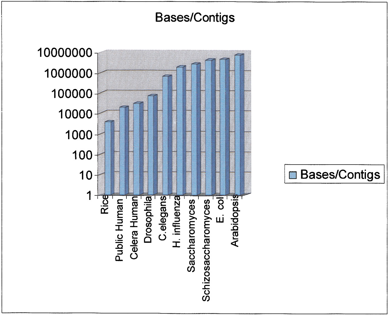 The figure shows the results of dividing the genome size by the number of contigs in the sequence at the time of initial publication. Although other ways to measure contig size are often used, such as N50, they were impossible to estimate on all of these projects. As a result we used this simpler metric, which provides a reasonable estimate of the degree of continuity in the sequence. Genomes represented and the source of the data are: Rice (indica) publicly available draft sequence (Yu et al. 2002); public human genome (Lander et al. 2001); Celera human genome (Venter et al. 2001); Drosophila melanogaster(Adams et al. 2000); Caenorhabditis elegans (The C. elegans Sequencing Consortium 1998); Haemophilus influenzae (Fleischmann et al. 1995); Saccharomyces cerevisiae (Saccharomyces Genome Database,http://genome-www.stanford.edu/Saccharomyces); Schizosaccharomyces pombe (Wood et al.); Escherichia coli (Blattner et al. 1997); and Arabidopsis thaliana (Arabidopsis Genome Initiative 2000).