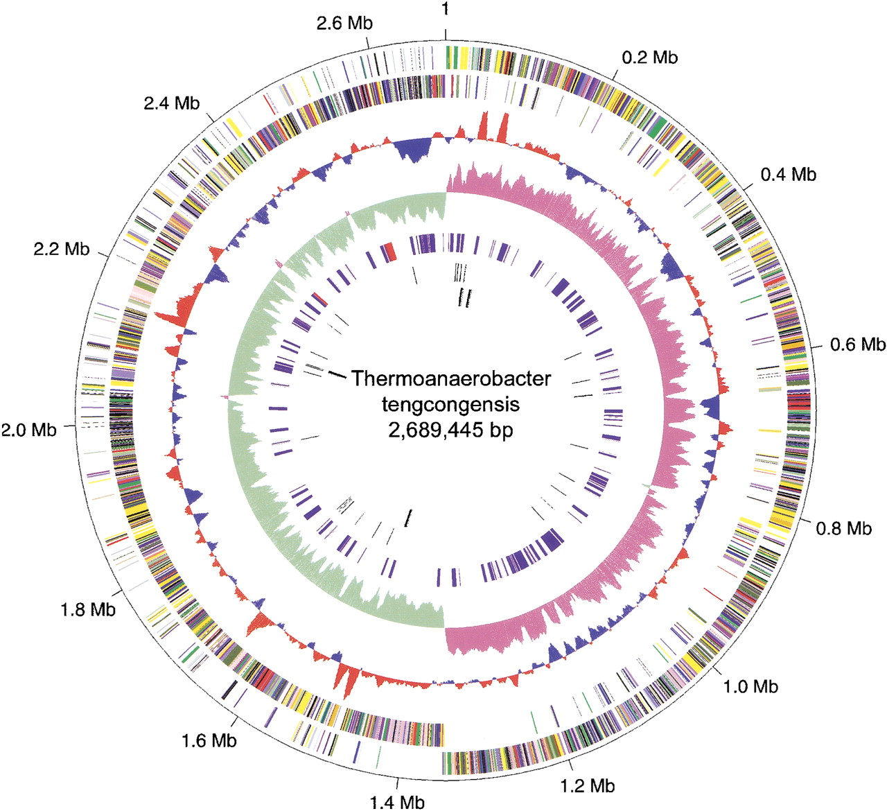 (a) Circular representation of the Thermoanaerobacter tengcongensis genome. Circles display (from the outside): (1) Physical map scaled in megabases from base 1, the start of the putative replication origin. (2) Coding sequences transcribed in the clockwise direction. (3) Coding sequences transcribed in the counterclockwise direction. (4) G + C percent content (in a 10-kb window and 1-kb incremental shift); values >37.6% (average) are in red and smaller in blue. (5) GC skew (G-C/G + C, in a 10-kb window and 1-kb incremental shift); values greater than zero are in magenta and smaller in green. (6) Repeated sequences; short 30-bp repeats are in red and other types in blue. (7) tRNA genes. (8) rRNA genes. Genes displayed in 2 and 3 are color-coded according to different functional categories: translation/ribosome structure/biogenesis, pink; transcription, olive drab; DNA replication/recombination/repair, forest green; cell division/chromosome partitioning, light blue; posttranslational modification/protein turnover/chaperones, purple; cell envelope biogenesis/outer membrane, red; cell motility/secretion, plum; inorganic ion transport/metabolism, dark sea green; signal transduction mechanisms, medium purple; energy production/conversion, dark olive green; carbohydrate transport/metabolism, gold; amino acid transport/metabolism, yellow; nucleotide transport/metabolism, orange; coenzyme metabolism, tan; lipid metabolism, salmon; secondary metabolites biosynthesis/transport/catabolism, light green; general function prediction only, dark blue; conserved hypothetical, medium blue; hypothetical, black; unclassified, light blue; pseudogenes, gray. (b) Linear representation of the T. tengcongensisgenome. Genes are color-coded according to different functional categories as described above for a , with above character-string representing gene names or IDs. Arrows indicate the direction of transcription. Genes with authentic frameshift and point mutations are indicated with X. Paralogous gene families are indicated by family ID in a box above the predicted genes. Numbers next to GES (Goldman-Engleman-Steitz) represent the number of membrane-spanning domains predicted by Goldman-Engleman-Steitz scale calculated byTMHMM. Proteins with five or more GES are indicated. The 305 copies of the 30-bp short repeat, clustered in two regions, are indicated with the greater-than symbol. RNA genes, including those of rRNA, tRNA, and other RNA genes, signal peptides and long repeats are also indicated. Numbers on the tRNA symbols represent the number of tRNAs in the cluster.
