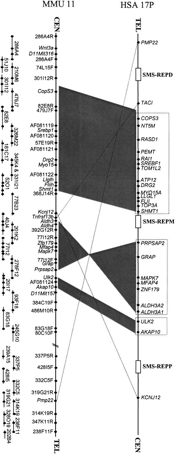 Comparison of the gene order in the human SMS common deletion region and its mouse syntenic region. Genes within the human SMS region on 17p11.2 are shown above. Open boxes represent the SMS-REPs. Below is shown the minimum BAC tiling path of the mouse syntenic region of the SMS common deletion interval and its flanking region. Each BAC clone is represented by a horizontal bar with STS-content markers represented by dots. Blocks of genes that show linkage conservation (i.e., identical gene order) in humans and mice are boxed and connected via gray shading.