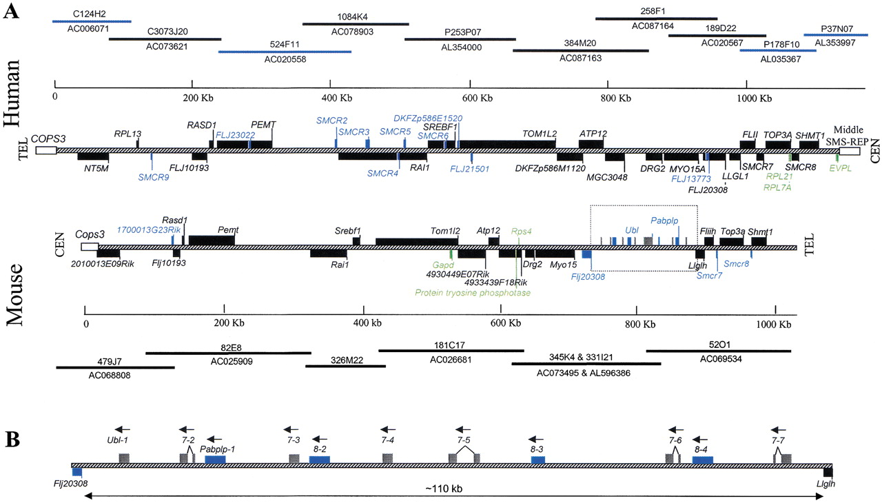 Transcript map of the SMCR and its mouse syntenic region. The BAC and PAC clones are identified by name and accession number. (A) Clones without a prefix are BACs from RPCI-11 (human) or from RPCI-23 (mouse); those with prefix P are PAC clones; those with prefix C are CTD clones. The hatched line represents the SMCR, and the open boxes represent the flanking sequences of the SMCR: COPS3 and the middle SMS-REP. The position 0 on the size scale is assigned to the nucleotide proximal to the putative promoter of the COPS3gene. Genes inside SMCR are represented by black boxes, predicted genes by blue boxes, and pseudogenes by green boxes. The predicted genesUbl and Pabplp are located between Flj20308 andLlglh, and both are present as a gene cluster. To distinguish from Pabplp, gray boxes were used to represent theUbl. Human genes transcribed from centromere to telomere are located above the central line, and genes transcribed from telomere to centromere are below the line. The mouse genes are drawn in the reciprocal manner (i.e., genes transcribed from telomere to centromere are above the central line). (B) The structure of the ∼110-kb gene clusters between Flj20308 and Llghlthat is boxed in A. Seven copies of Ubl and four copies of Pabplp are intermixed. Solid lines connecting exons represent the splicing pattern. All copies are potentially transcribed in the same direction (arrows). The Ubl gene appears to have four copies with spliced variants.