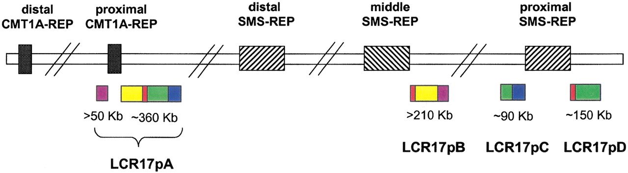 Schematic representation of low-copy repeats (LCRs; >10 kb) in proximal 17p, including SMS and CMT1A chromosome regions. Colored boxes represent positions of highly similar sequence of LCR structures. Note that the at least 410-kb repeat, LCR17pA, flanking the proximal CMT1A-REP has three partial copies: LCR17pB, proximally adjacent to the middle SMS-REP, and LCR17pC and LCR17pD (also described as PSFS;Stankiewicz et al. 2001) flanking the proximal SMS-REP.
