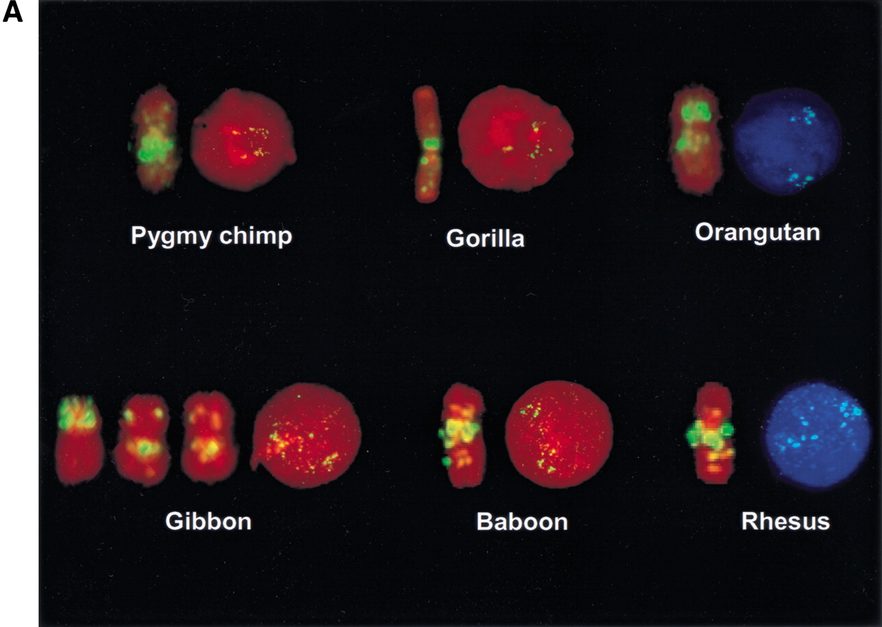 FISH analyses for evolutionary studies. (A) Metaphase and interphase cells of chimpanzee, gorilla, orangutan, gibbon, baboon, and rhesus after hybridization with SMS-REP bacterial artificial chromosome (BAC) RP11–158M20. (B) The interphase nuclei of New World squirrel monkey after cohybridization of differentially labeled SMS-REP-specific BAC (RP11–158M20) and a P1 artificial chromosome clone that directly flanks SMS-REP (RP1–178F10). Note the single yellow foci, indicating the <100-kb physical vicinity of the clones. Similar results were obtained using five other clones directly flanking individual SMS-REPs, showing the presence of three copies of SMS-REPs.