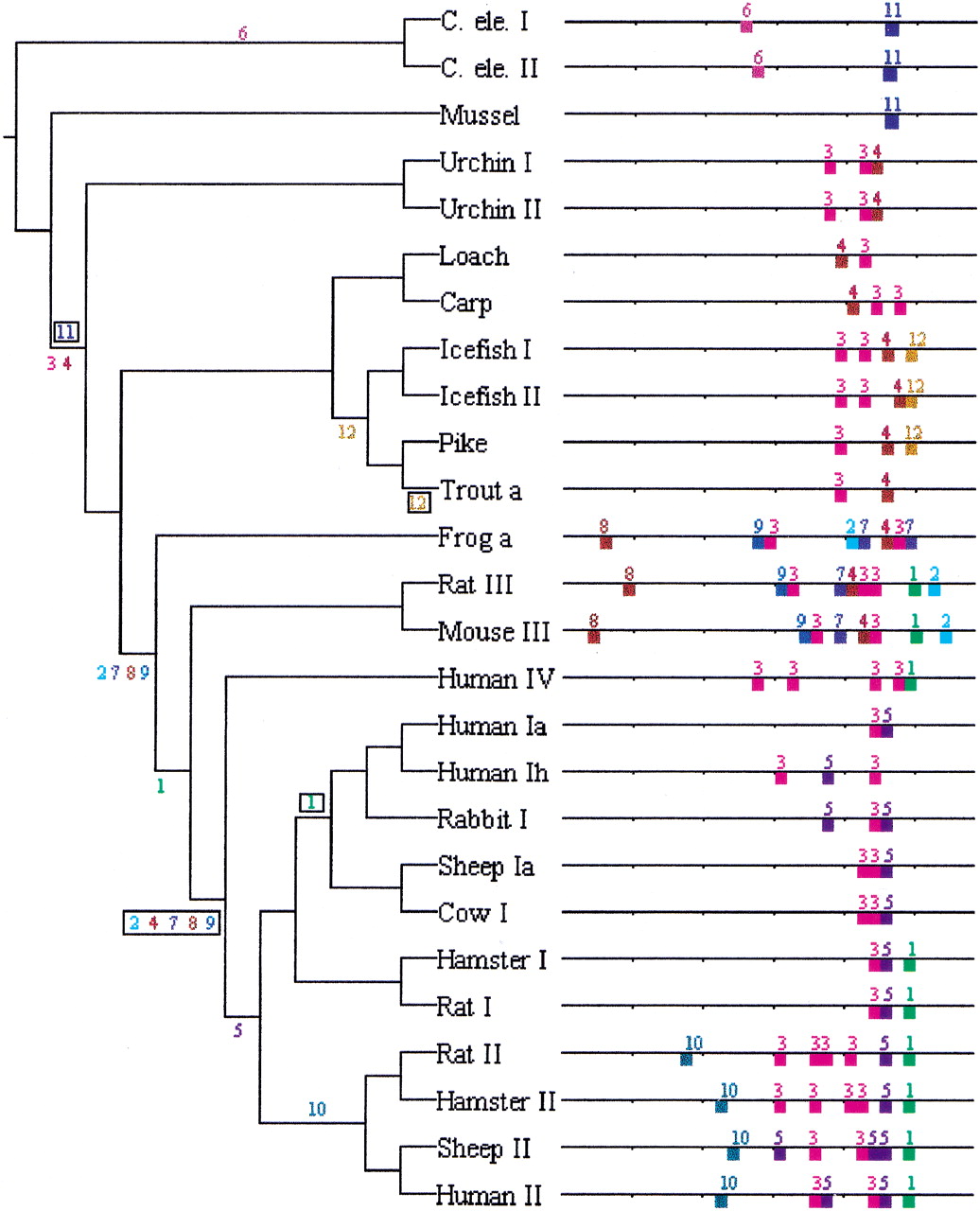 FootPrinter identified 12 highly conserved motifs in the metallothionein gene family. Each input sequence is the 590 bp located upstream of the start codon. For more details on each motif, see Table1. The phylogenetic tree is derived from Binz and Kägi (1997; branch lengths not to scale). Numbers along branches indicate when each motif was created (unboxed) or lost (boxed), ignoring any less conserved occurrences of the motif not reported by FootPrinter.