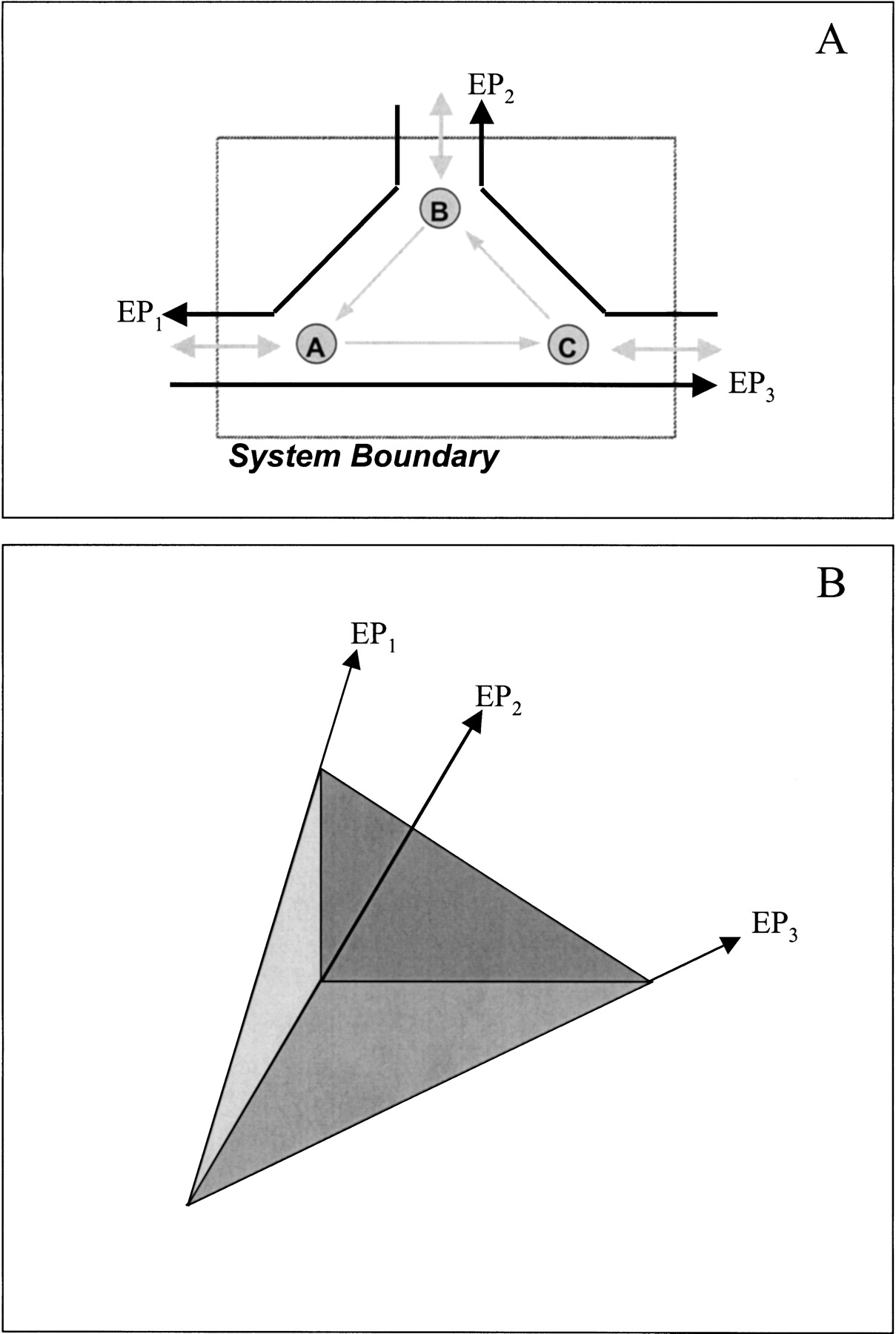 A sample biochemical reaction network (A) and the convex representation of its metabolic possibilities (B). The extreme pathways (EPs) in B correlate with those in A, serving to represent the relationship between extreme pathways of a biochemical reaction network and the characterization of the possible phenotypes.