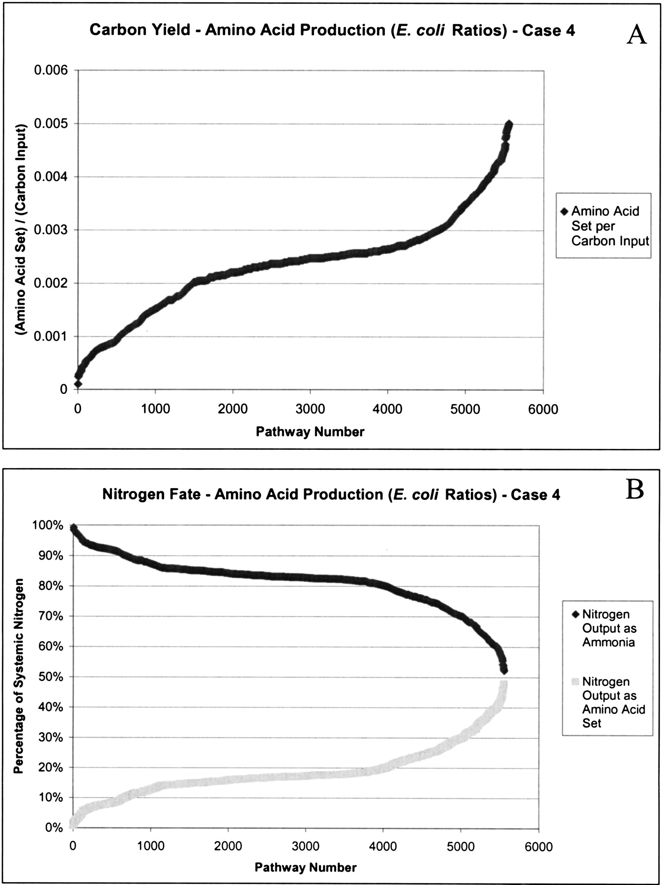 Carbon yield (A) and nitrogen fate (B) plots for the production of the nonessential amino acid set in Escherichia coli ratios.