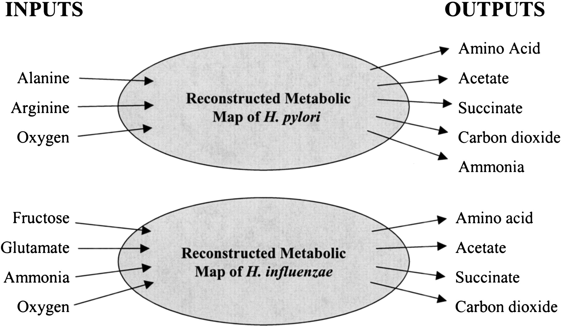 The exchange flux constraints used for the comparison of the two organisms H. influenzae and H. pylori. Note that more inputs were allowed into both systems, but the indicated inputs were the only ones used by these in silico strains. The organisms had identical output fluxes, with the exception of ammonia as a necessary output for H. pylori. The individual amino acids included in the comparison were asparagine, aspartic acid, glutamine, lysine, proline, serine, threonine, and tyrosine.