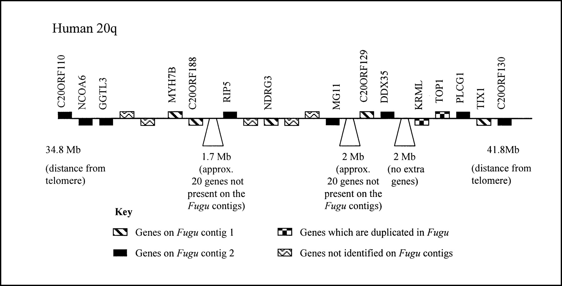 Fugu/human 20q11.2–12 comparative gene map. This ideogram provides a more detailed comparison between the two Fugucontigs and a 7-Mb section of human 20q (a section that contains the human orthologs of two of the genes, KRML and TOP1, known to be duplicated in Fugu). The orthologs of ∼25% of the genes mapping to this region are represented on one or another of the twoFugu contigs. The distribution of the genes between the twoFugu contigs, however, appears to be random, indicating a pattern of duplication in the Fugu lineage followed by the loss (in the majority of cases) of one of the additional gene copies.