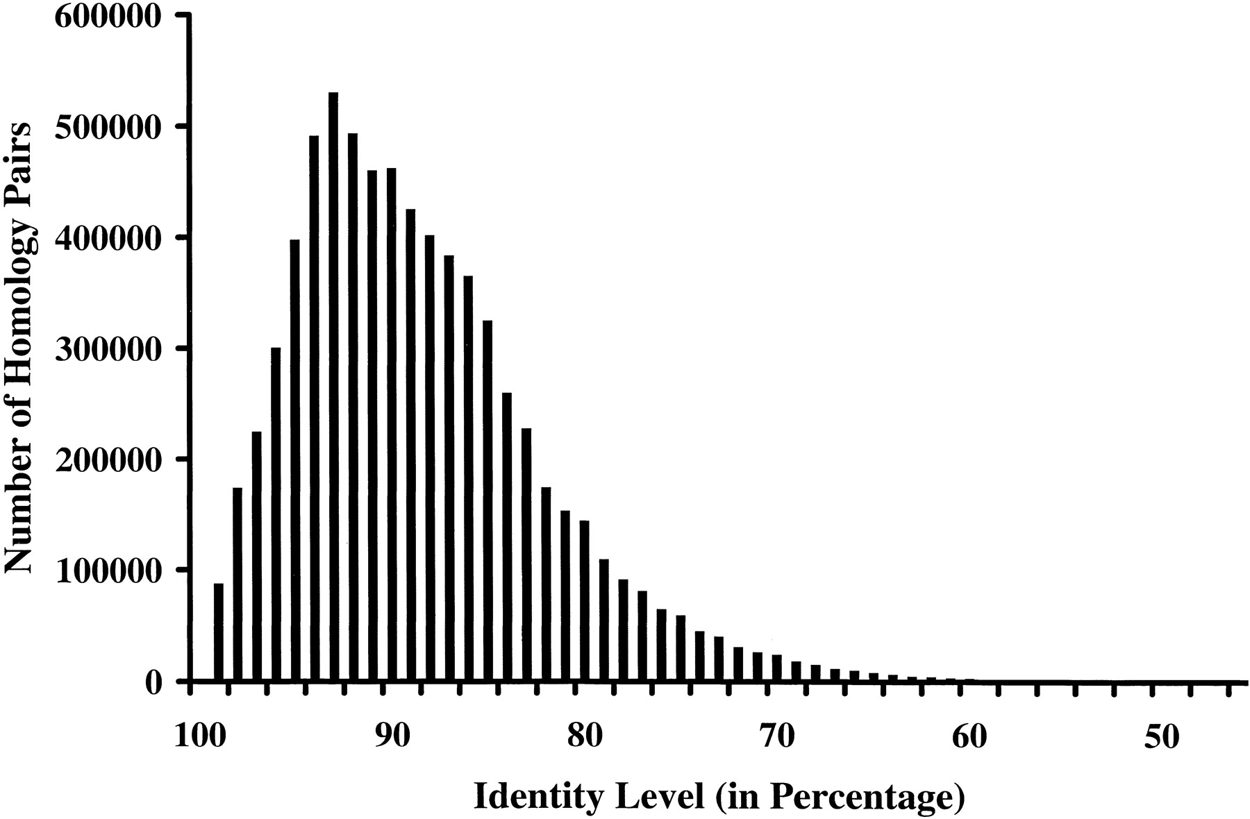 The number of protein pairs at different identity levels in clusters identified at greater than 89% identity level through single-linkage clustering. The result indicates that single-linkage clustering efficiently grouped proteins into clusters.