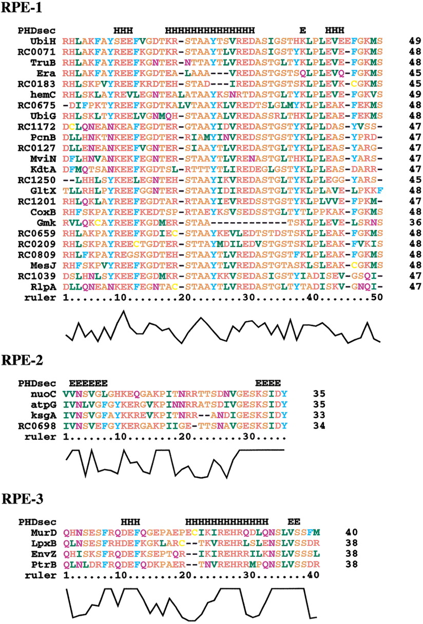 Multiple sequence alignments for the amino acid sequences translated from the palindromic sequences (RPE-1, RPE-2, and RPE-3). Amino acid residues are colored as follows: blue for F, W, and Y; yellow for C; orange for A, G, P, S, and T; green for I, L, M, and V; red for D, E, H, K, and R; purple for N and Q. The letters ‘H’ and ‘E’ in the first line of each alignment represent the predicted α-helices and β-strands, respectively. ClustalX alignment quality scores are shown at the bottom of the alignment.