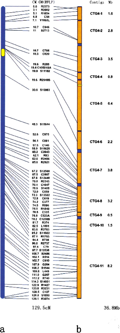 Comparison between the genetic and physical maps of the rice chromosome 4. (A) A genetic linkage map. Genetic markers (GM), genetic distance (cM), and centromere (in yellow) are indicated. (B) A physical map. The portions of the 11 BAC contigs covering 34.5 Mb of the chromosome are in orange and the gaps in plain. The physical distance is indicated (Mb). The maps also show a discrepancy of two markers R2502 (3.1 cM) and R2373 (0 cM) between the genetic and physical maps revealed by DNA sequencing and fluorescence in situ hybridization (FISH) analysis (cross lines).