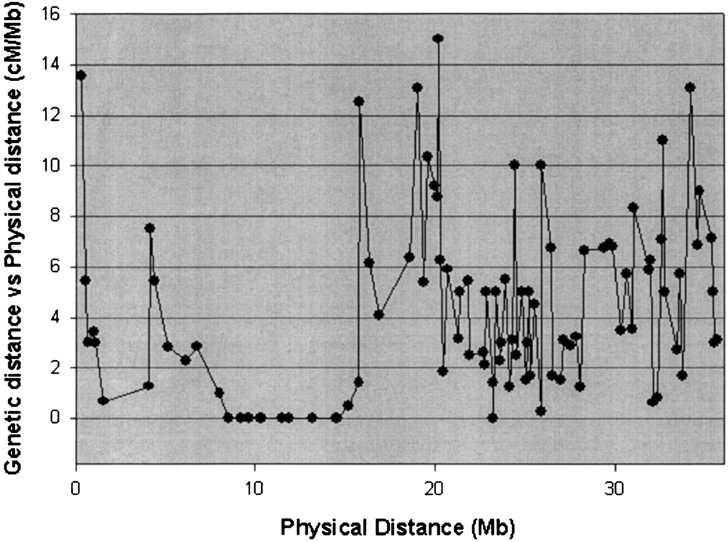 A relationship between the genetic recombination frequency and the physical distance of the rice chromosome 4. X axis shows the physical distance in cM along the chromosome 4. Y axis indicates the ratio of the genetic distance versus the physical distance (cM/Mb).