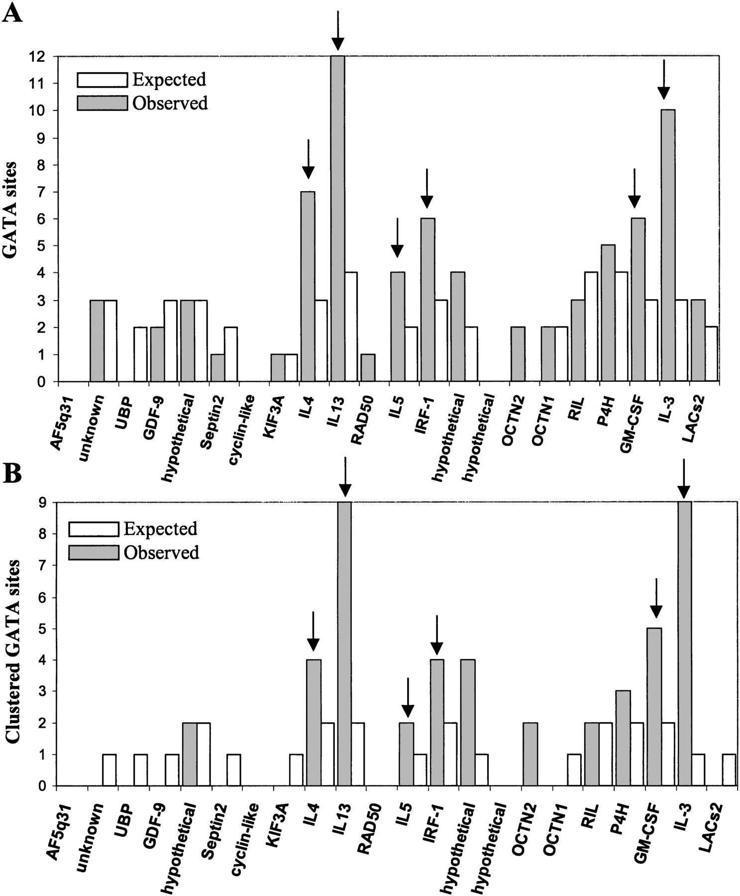 Distribution of conserved GATA-3 binding sites across the 22 promoter regions (2 kb upstream of 5′UTR) of all annotated genes from the 1-Mb cytokine gene cluster (Hs5q31; Mm11). Cytokine genes are labeled by arrows, gray bars indicate observed GATA-3 sites, and open bars represent predicted GATA-3 sites as a result of random distribution. Random distribution was estimated on the basis of the frequency of GATA-3 sites across the 1-Mb human sequence and the DNA conservation of each promoter. (A), conserved individual GATA-3 sites. (B), conserved GATA-3 present in clusters (two or more conserved sites enclosed in a 60-bp DNA fragment).