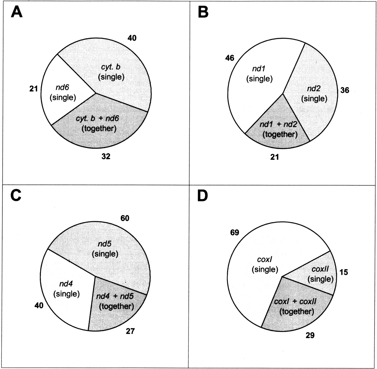 Numbers of loci containing adjacent pseudogenes or their respective isolated entities. Certain adjacent mtDNA genes are expressed from distinct mRNA species. This is the case for the four examples shown. Panel A shows the number of integrations of isolatednd6 and cyt. b pseudogenes in comparison with the integration of fragments that contain both genes in the same arrangement to each other as in mtDNA. Panels B–Dshow the results for the same type of analysis for the couplesnd1 + nd2, nd4 + nd5, andcoxI + coxII, respectively.