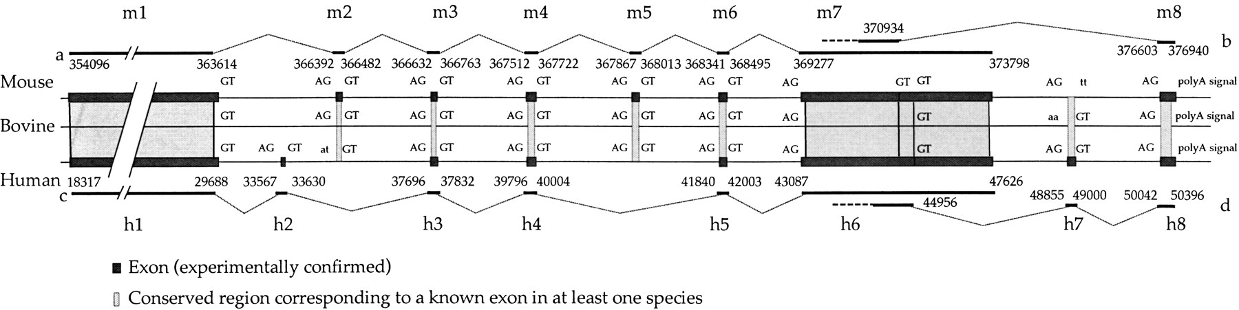 Comparison of Xist gene intron–exon structure in mouse, bovine, and human. Introns and the first exon are not drawn to scale. Conserved regions corresponding to known exons (in at least one species) are indicated. Consensus splice signals that align with boundaries of known exons are in capitals. In mouse and human, 8 exons have been identified (Brown et al. 1992; Sheardown et al. 1997). Note, however, that some exons in mouse have no counterpart in the human and vice versa. To avoid ambiguities in exon numbering, we used the prefix “h” to identify human exons, and “m” to identify mouse exons. Mouse exons m1, m3, m4, m6, m7, and m8 are conserved and correspond to human exons h1, h3, h4, h5, h6, and h8, respectively. In both species, we identified an alternative donor splice site in exon m7–h6, although it is not located exactly at the same position in human and mouse. With the exception of this splice site, splice signals (donor and acceptor) of these six exons, as well as the polyadenylation signal in the last exon, are perfectly conserved in mouse, man, and bovine (which suggests that they also correspond to true exons in the latter species). Human exon h2 is located in a region that is not conserved in mouse or bovine. Mouse exon m2 is conserved in the three species, with correct splice signals, except in human where the splice acceptor is mutated (AT instead of AG), which suggests that this exon is no longer functional in human. Mouse exon m5 is conserved in the three species with correct splice signals and might correspond to an unidentified alternative exon in humans. Human exon h7 is located in a region that is conserved in the three species, but consensus splice signals are not found in mouse and bovine. a, mouse Xist cDNA (GenBank accession number L04961; Brockdorff et al. 1992); b, mouse ESTs (BE626785, BE632200, and R74734); c, mouse exon m7a reported by Hong et al. (1999); d, human XIST cDNA (M97168; Brown et al. 1992); e, human exon h6a reported by Hong et al. (2000); f, human ESTs (AV699347,AV700119, and AV700677). Exon positions in mouse (bp): m1, 354096…363614; m2, 366392…366482; m3, 366632…366763; m4, 367512…367722; m5, 367867…368013; m6, 368341…368495; m7a, 369277…376940; m7b, 369277…371600; and m8, 376603…376940. In human, exon positions are indicated relative to the XIST genomic sequence (U80460): h1, 18317…29688; h2, 33567…33630; h3, 37696…37832; h4, 39796…40004; h5, 41840…42003; h6a, 43087…50396; h6b, 43087…44956; h7, 48855…49000; and h8, 50042…50396.