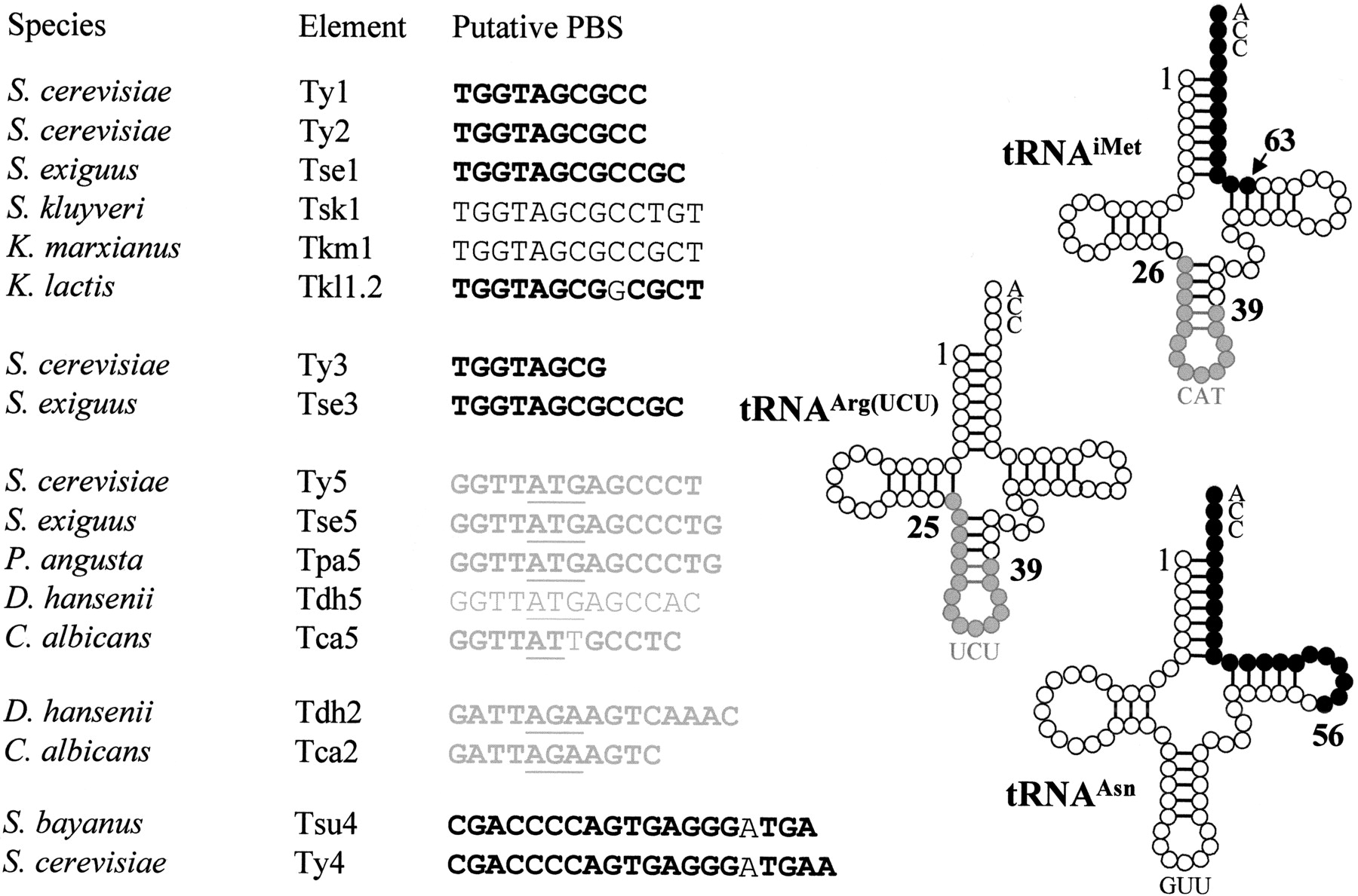 Primer-binding sites of LTR-retrotransposons and tRNA molecules of hemiascomycetous yeasts. The TGG trinucleotide starting most of the PBSs is complementary to the CCA trinucleotide present at the 3' end of all tRNAs and is characteristic of PBSs that utilize the 3' end of a tRNA as a primer. In contrast, the PBSs that are complementary to internal positions of tRNAs include the anticodon stem-loop (underlined). The tRNA molecule, residues that are complementary to PBS are indicated in black when located at the 3' end of the molecule and in gray when located in the internal part. Similarly, PBS sequences are written in black or gray depending on their positions. PBS sequences in bold indicate that the PBS was deduced from the comparison with the tRNA gene identified in the species. The mismatches in the PBS sequences of Tkl1.2, Tca5, Tsu4 and Ty4 are not in bold.