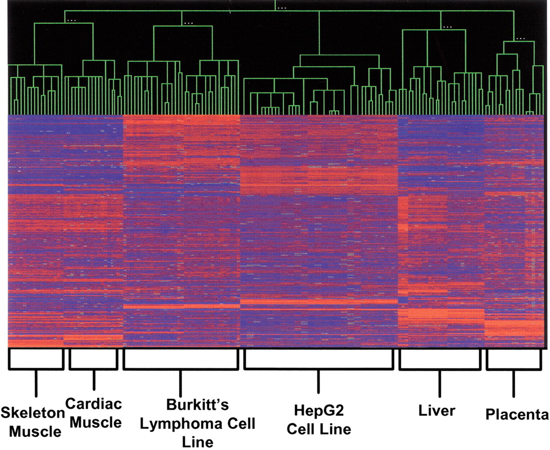 Hierarchical clustering. Microarray data from 161 Human UniSet I microarrays, corresponding to 84 aRNA target preparations from total RNA isolated from 6 different tissues (duplicate microarrays for 77 target preparations and single microarrays for 7 target preparations), were clustered using the Pearson correlation coefficient. The blue color indicates no expression, and red indicates a high expression level. There was a single source for both muscle types, two different Burkitt's lymphoma cell lines, two separate harvests of HepG2 cells, three liver sources, and two placental sources.