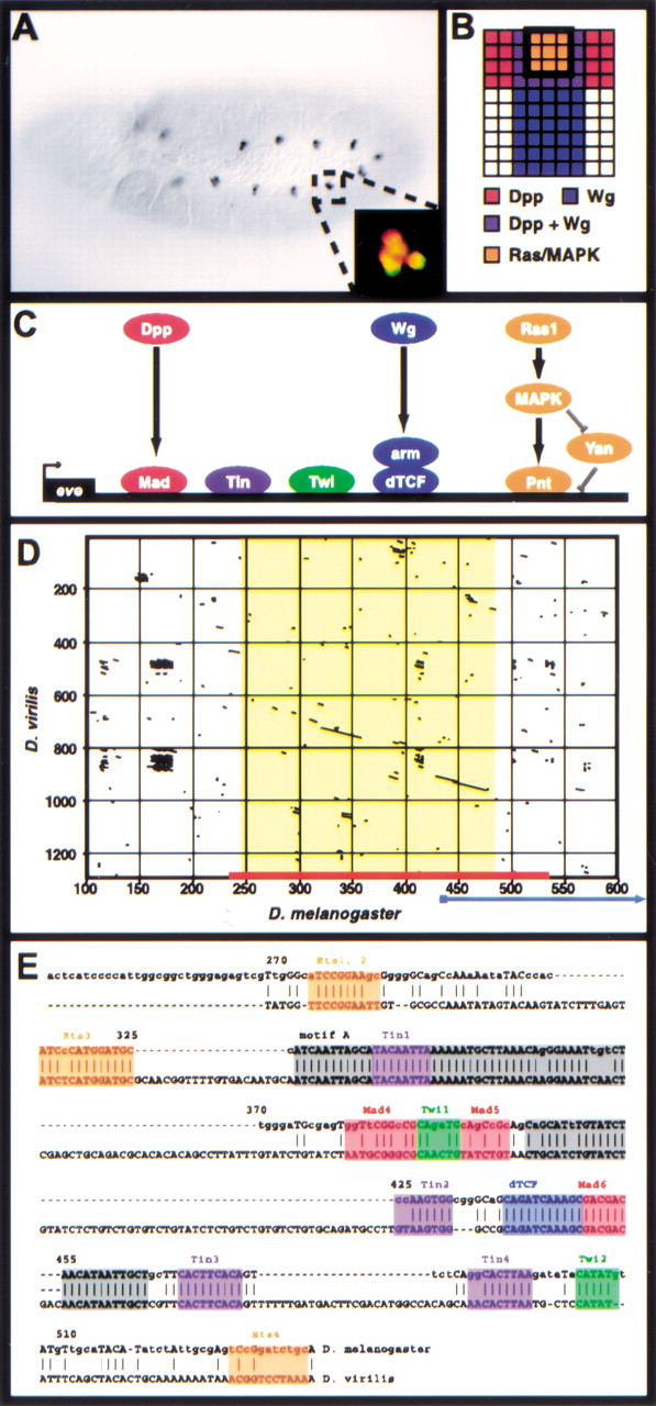The Eve MHE provides a model for the transcriptional integration of multiple intercellular signals. (A) Stage 11Drosophila embryo stained with antibodies against Eve. A small cluster of cells in the dorsal mesoderm of each segment, the Eve-positive muscle and cardiac progenitors, express Eve. Anterior is to the left. Inset: Double-staining for Eve (green) and the MHE reporter construct (red) shows that the MHE is sufficient to drive expression in the Eve-positive cells (Halfon et al. 2000). (B) Signaling events required for Eve expression in the dorsal mesoderm. One hemisegment is represented, with dorsal to the top and anterior to the left. Expression of Eve is induced in cells that receive signaling from the Dpp, Wg, and Ras/MAPK pathways (Carmena et al. 1998). (C) The transcriptional code used at the MHE. The signal-responsive TFs, that is, Mad, dTcf, and Pnt bind along with the mesodermal selector proteins Twi and Tin to activate transcription. (D) Dot plot showing that the MHE sequence (x-axis, red bar) is conserved in D. virilis (y-axis). The area of extensive homology (on the diagonal) is shown in yellow; little homology exists flanking this region for several hundred base pairs. An alternate sequence recently proposed to have MHE-like activity (Knirr and Frasch 2001) is indicated by the blue arrow; note that most of this sequence lies in nonconserved regions. (E) Sequence alignment of MHE and vMHE. Known MHE binding sites are shown in color; gray boxes indicate conserved regions where functional sites have not yet been identified. Base pair numbering corresponds to that shown inD.