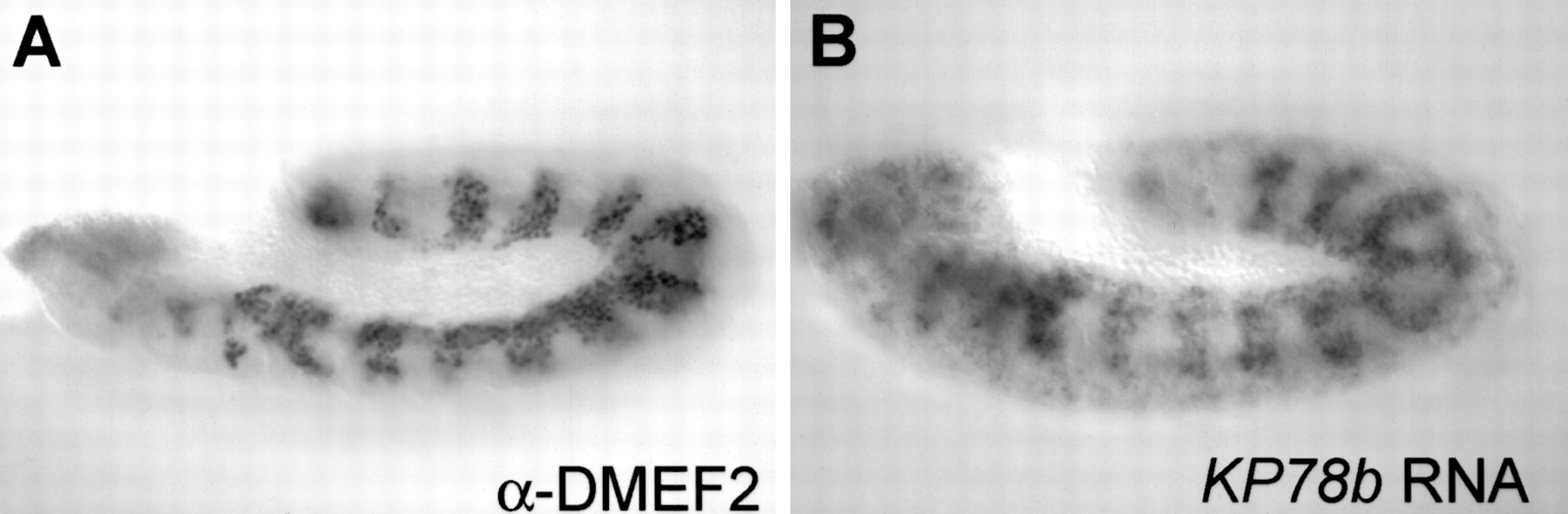 Additional elements identified in the search map in proximity to mesodermally expressed genes. Pictured is antibody staining showing mesodermal expression of DMEF2 (A) and whole mount in situ hybridization of KP78b RNA (B), a gene not previously known to be expressed in the mesoderm.