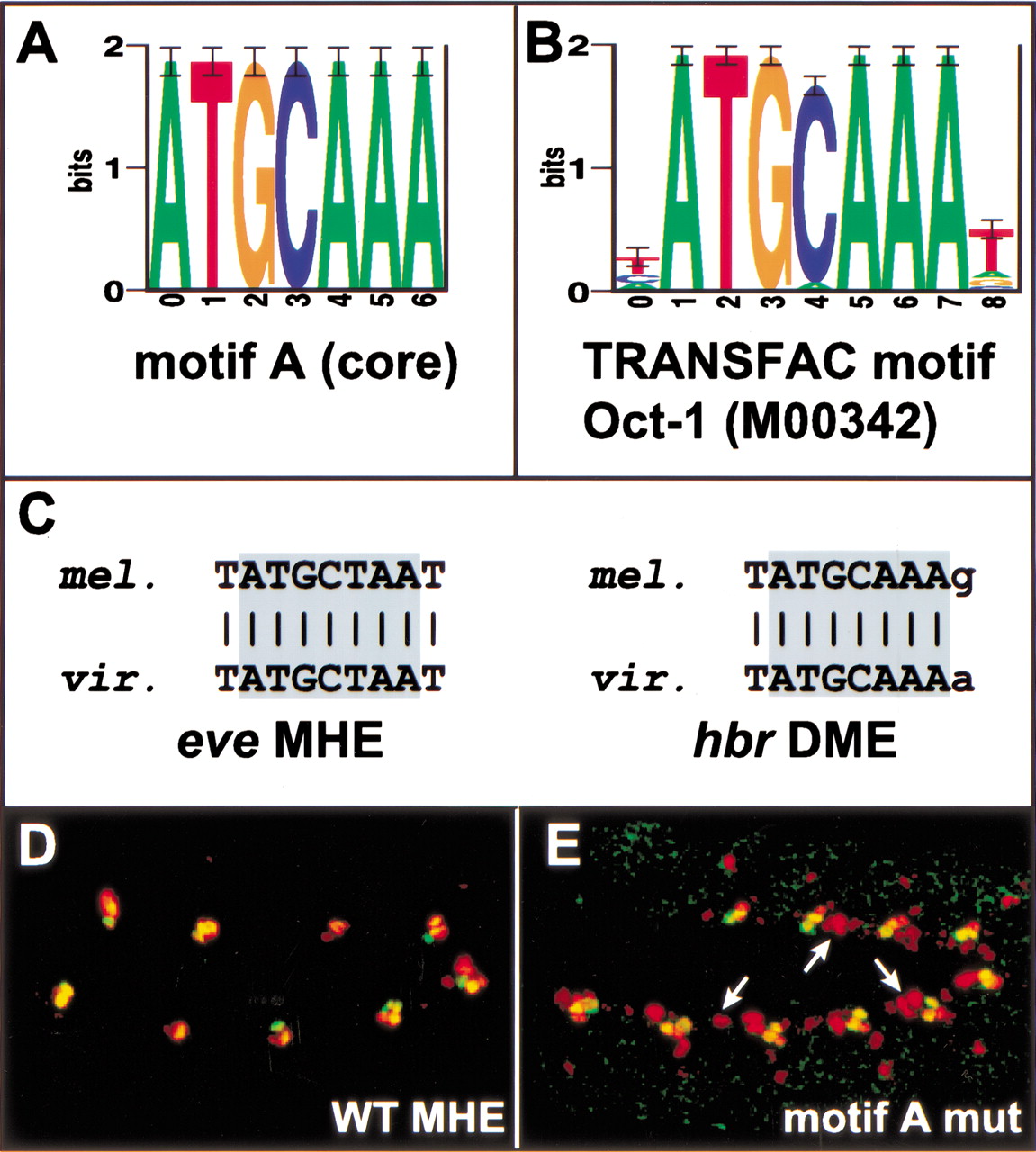 Identification of a new functional motif using AlignACE. (A) Sequence logo (Schneider and Stephens 1990) showing the motif A core as identified by AlignACE. (B) Sequence logo for the POU/homeodomain TF Oct-1 from TRANSFAC (Wingender et al. 2001; accession #M00342). (C) Alignments of motif A from the Eve MHE and Hbr DME with the corresponding sequences fromD. virilis. (D) Wild-type and (E) motif A site mutated Eve MHE reporter gene expression (red) along with endogenous Eve expression (green). The motif A mutation leads to an expansion of reporter gene expression along the anteroposterior axis (arrows).