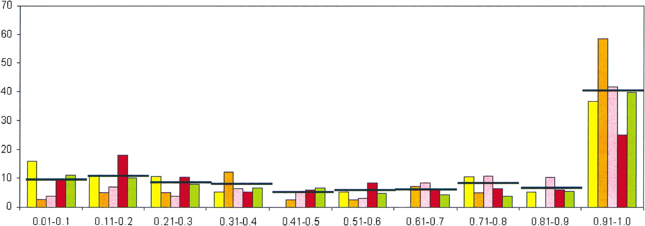 Distribution of lineage-specific clusters by Expansion Coefficient (EC).The X-axis shows ranges of EC values (see text) and the Y-axis shows the percentage of LSCs within each EC range. (Yellow)Schizosaccharomyces pombe; (orange) Saccharomyces cerevisiae; (pink) Drosophila melanogaster; (red)Caenorhabditis elegans; (green) Arabidopsis thaliana.In each class, the average value of the five species is indicated by a horizontal line.