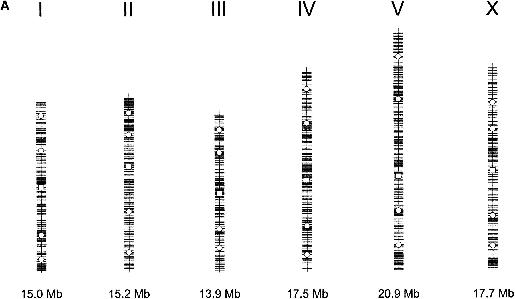 Distribution of single nuclear polymorphism (SNP) markers across theCaenorhabditis elegans genome. (A) Marker distribution along the physical map of chromosome. The location of the Tier 1 SNP markers are shown with open squares, and the location of Tier 2 markers are shown by open circles. The location of each of the validated 1099 markers is shown along the chromosomal axis. The largest gap is 449 kb (chromosome I), and the average validated marker spacing is 91 kb ± 56 kb. (B) Recombination rates across the six chromosomes. The physical (Mb) location of all predicted polymorphisms (y-axis) is plotted versus the extrapolated genetic (cM) location (x-axis) of the associated cosmid across the genome (Genetic Map Position from Wormbase; Stein et al. 2001). This illustrates the rate of change in the recombination rate across the chromosome and shows the “gene cluster” effect in the center of the autosomes (Barnes et al. 1995). This information is used during mapping, because the local recombination rate affects the number of putative recombinants that must be genotyped to obtain a 100-kb interval.
