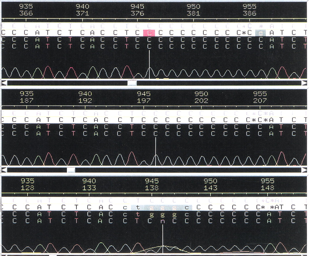 Three fluorescent gel electrophoresis sequencing chromatograms of the same genomic DNA region from chromosome 19 showing the unresolved region of the polycytosine string. Each of these three chromatograms indicated a different number of cytidines.