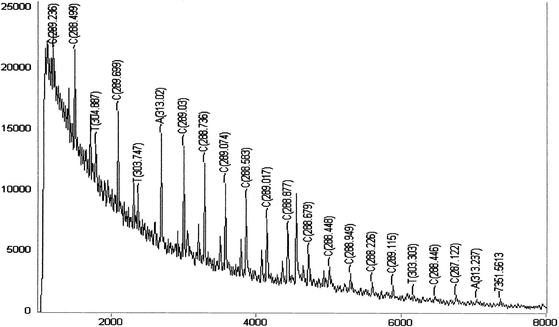 Negative-ion MALDI-TOF-MS spectrum of a PCR product after exonuclease digestion. This spectrum clearly shows the presence of 11 consecutive cytidines flanked by the known sequence at the 3′ and 5′ ends. The doubly charged ion of the remaining undigested PCR product gave an approximate mass-to-charge (m/z) value of 4581 between the sixth and the seventh sequential cytidines. The secondary series of peaks visible between 2000 and 4500 amu are mainly caused by partial digestion of the complementary strand of the PCR product from the 3′ end.