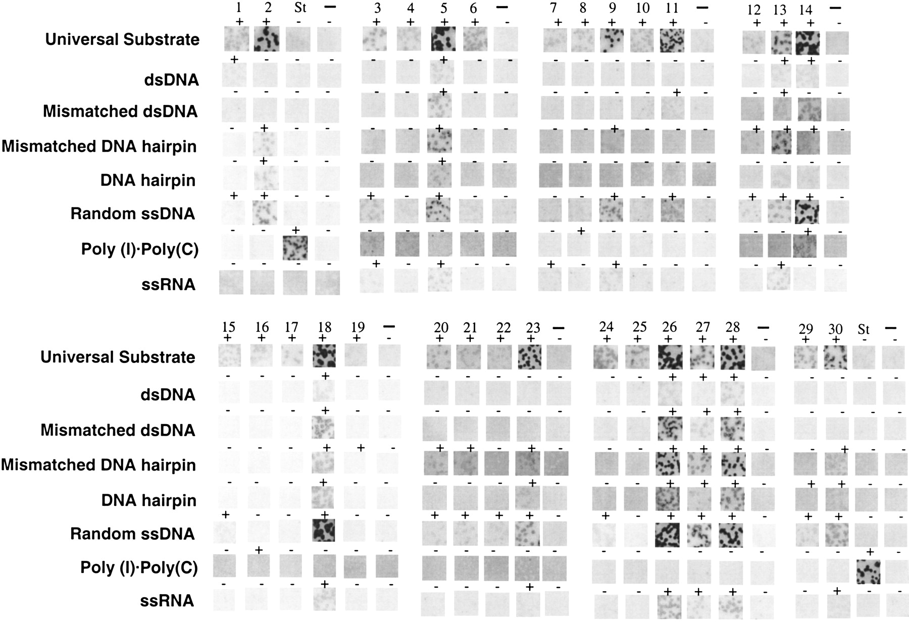 Sorting nucleic acid binding proteins. Each block represents an independent experiment. Numbers at top refer to gene identity (see Table 1a); (St) Staufen; negative control. (+/−) The binding activity of each clone to the corresponding binding substrate.