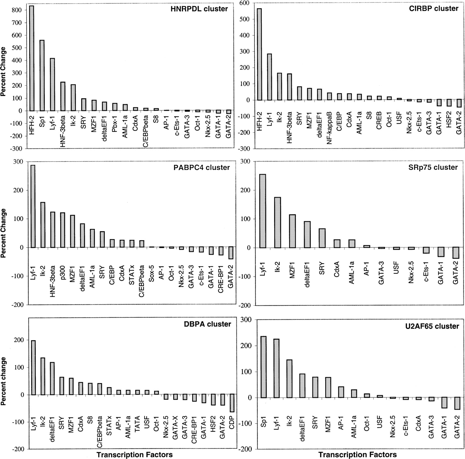 Relative abundance of transcription factor binding sites in experimentally derived versus random DNA sequence clusters. Each panel refers to a cluster of genes coregulated with a queried gene. The ratio of the relative abundance of each transcription factor binding site in a real (experimentally derived) compared with a random DNA sequence cluster is expressed as a percent change on the Y-axis. Transcription factors are plotted on the X-axis.