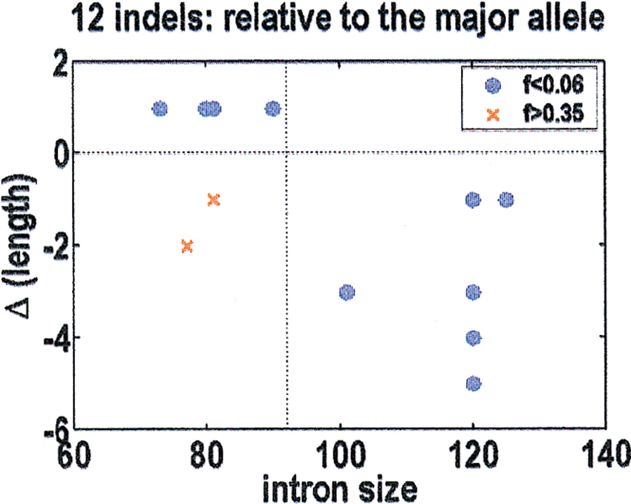 Insertion-deletion (indel) direction, relative to the major allele, as a function of intron size. For the 10 rare indels of minor allele frequency f < 0.06 (blue), the resultant size changes drive the introns back to their optimal size of 92 bp. The two common indels with f > 0.35 (red) are the only exceptions to this rule, presumably because they arose from a different population dynamics.