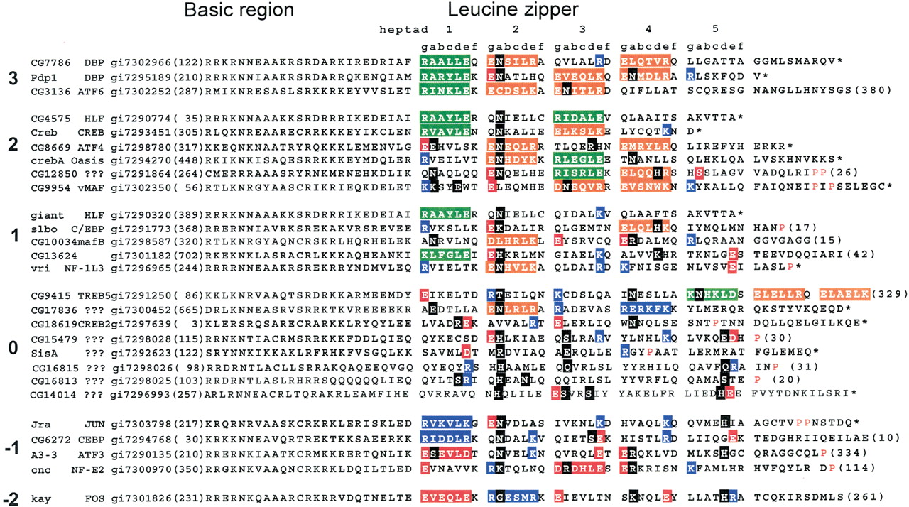 Alignment of 27 identified Drosophila melanogaster B-ZIP motifs using the single letter amino acid code. The proteins are arranged into groups based on the number of attractive g↔e‘interactions minus repulsive g↔e‘ interactions ranging from 3 to –2 pairs. The column starts with the name of the protein. Next is the name of the closest mammalian homolog, followed by the gi# for the Drosophila melanogaster sequence. The protein sequence of the B-ZIP motif follows. The number of amino acids from the predicted N terminus of the protein to the B-ZIP motif is given in parentheses. The C terminus of each sequence is either the natural C terminus denoted by an asterisk (*), or a truncation with the number of amino acids to the C terminus in parentheses. To help visualize the potential g↔e‘ interactions, we grouped heptads (gabcdef). If both the ‘g’ and ‘e’ positions contain charged amino acids, we color both of these amino acids and the intervening ones (gabcde). We use green for the attractive basic–acidic pairs (R↔E and K↔E, K↔D), orange for the attractive acidic–basic pairs (E↔R, E↔K, D↔K, and D↔R), red for the repulsive acidic pairs (E↔E, D↔E, and E↔D), and blue for the repulsive basic pairs (K↔K, R↔K, K↔R, and R↔R). If only one of the two amino acids in theg↔e‘ pair is charged, we color only that amino acid: red if it is acidic and blue if it is basic. If the ‘a’ or ‘d’ positions contain polar or charged amino acids, they are colored black. The α-helix breaking prolines, indicative of the C terminus of the leucine zipper, are colored red.