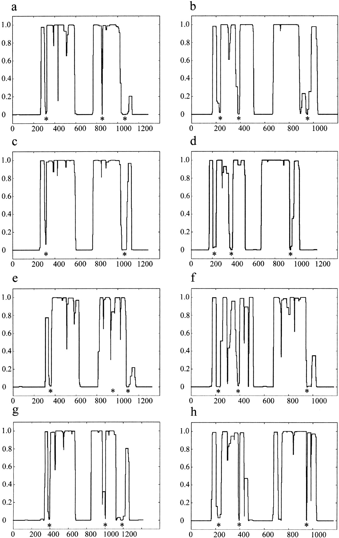 COILS prediction of SMC2 and SMC4 orthologs. TheCOILS output for Homo sapiens SMC4 (a),H. sapiens SMC2 (b), Xenopus laevi SMC4 (c), X. laevi SMC2 (d), fission yeast (Schizosaccharomyces pombe) SMC4 (e), fission yeast SMC2 (f), budding yeast (Saccharomyces cerevisiae) SMC4 (g), and budding yeast SMC2 (h). The vertical axis denotes the probability of the amino acid sequence adopting a coiled-coil structure based on a scanning window of 28 residues. Conserved disruptions in the coiled-coil structure prediction to the condensin SMC sequences are indicated beneath the COILSprofile with an asterisk.