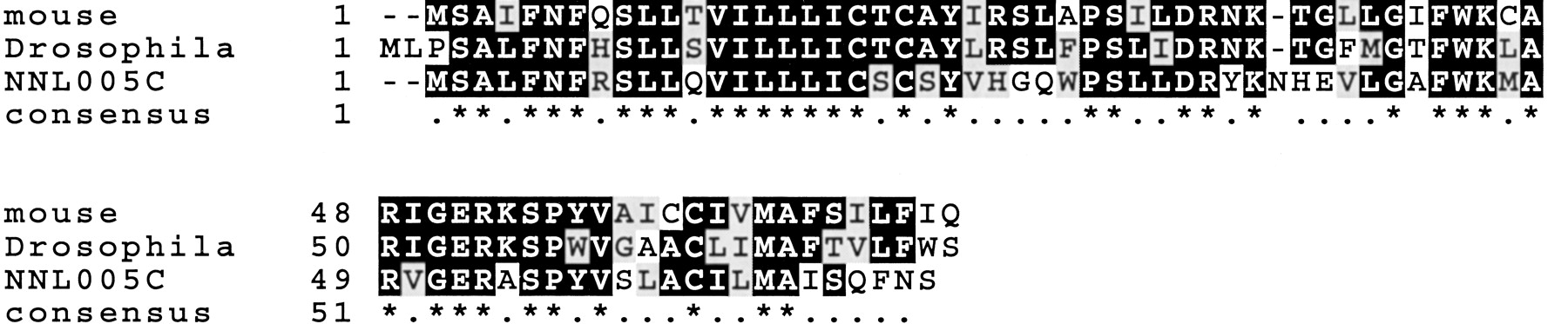 Homologs of NORF NNL005C are found in other species.CLUSTAWL alignment of homologous protein sequences from the mouse RIKEN cDNA 0610041E09 gene, Drosophila CG14199 gene, and the yeast NORF NNL005C. The mouse sequence scores (P < 8.3 × 10−22) and theDrosophila sequence scores (P < 2.0 × 10−20).