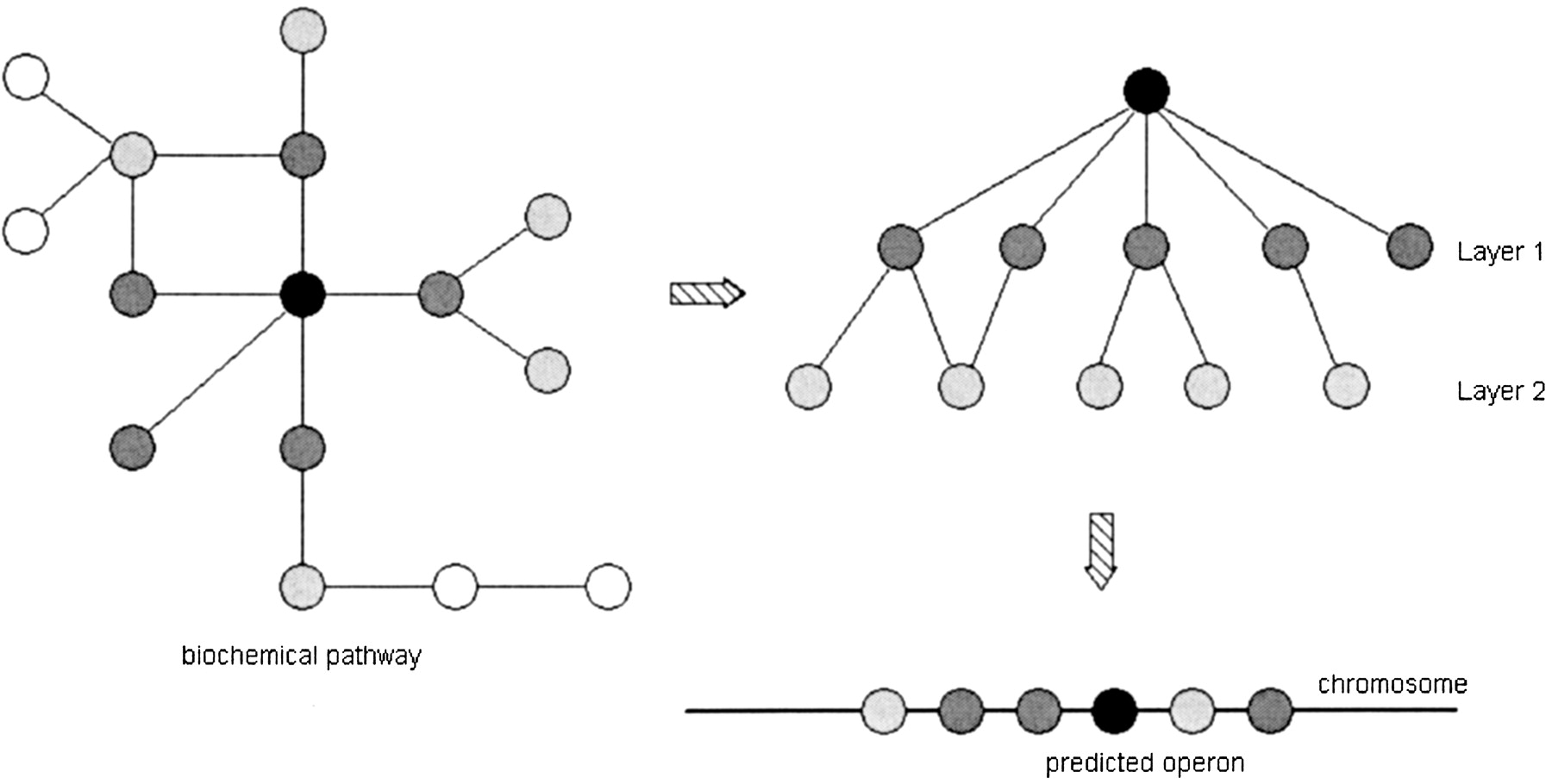 A graphical interpretation of breadth-first search (BFS) graph traversal. The black vertex is the start vertex for BFS traversal in a metabolic pathway. In this example, the depth parameter is set to 2; the first layer is filled with dark gray and the second layer is filled with light gray. After a tree is returned from traversal, we locate the gene in the genome with the same EC number as the start vertex and extend a window on each side of it. We then compare genes in this window and in the traversal tree by EC numbers. If there is more than one match, this gene cluster window is marked for further pruning.