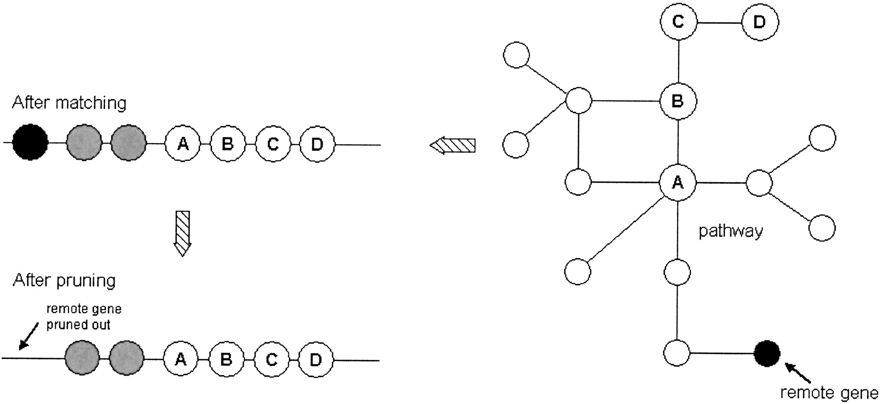 Graphical illustration of pruning procedure. Nodes with the labelsA,B,C,D in the pathway graph and the genome (line) are matched enzymes. The black vertex is the remote gene, which is three reaction steps away from the nearest gene (A) in the graph and three open reading frames (ORFs) away from the nearest gene (A) on the chromosome (gray genes are genes that were not matched). Consequently, the black vertex gets pruned from the cluster. The idea of pruning is implemented by computing the shortest distance in the graph from each matched vertex to the nearest matched vertex. A special case occurs when only two genes are reported as a possible operon. If their metabolic distance is equal to 3, they are pruned out.