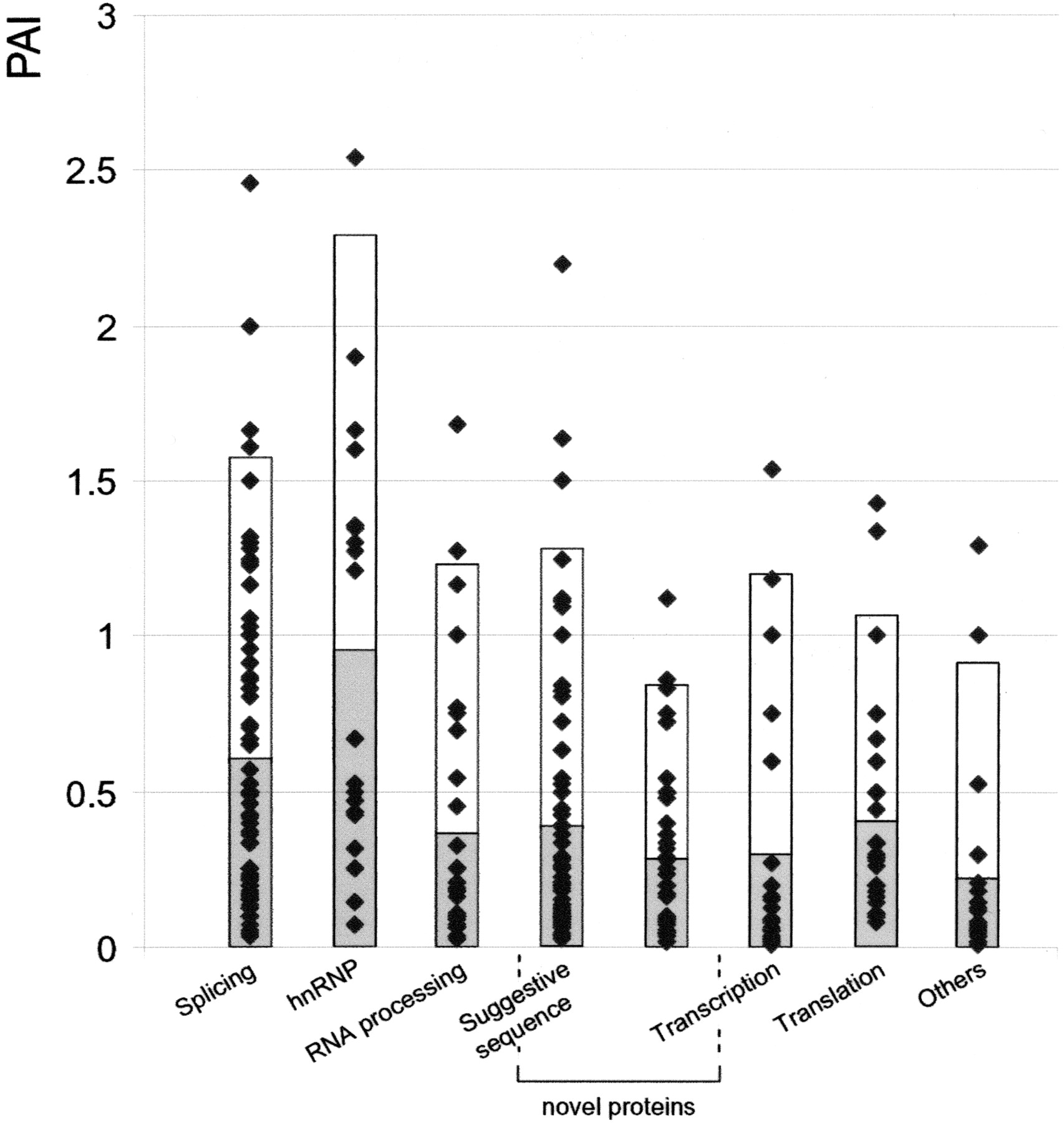 Protein abundance index (PAI) for the identified proteins. Plot of PAI index, which is defined as the number of identified peptides divided by the number of calculated, observable peptides, plotted for the identified proteins in seven different classes. The individual spots represent the PAI for each protein in the category. The bar shaded in gray extents to the average value of the PAI for each category. The white bar encompasses 95% of the proteins in each category.